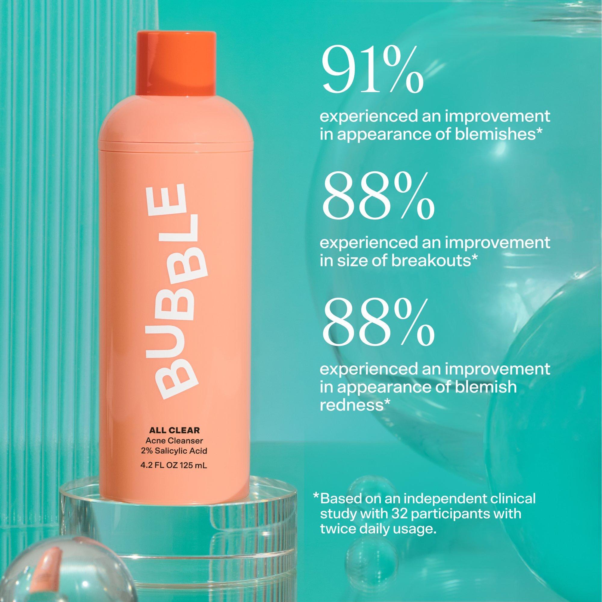 Bubble’s ALL CLEAR Anti-Breakout Cleanser with 2% Salicylic Acid helps prevent breakouts by clearing away dirt, oil, and other pore-clogging nasties.