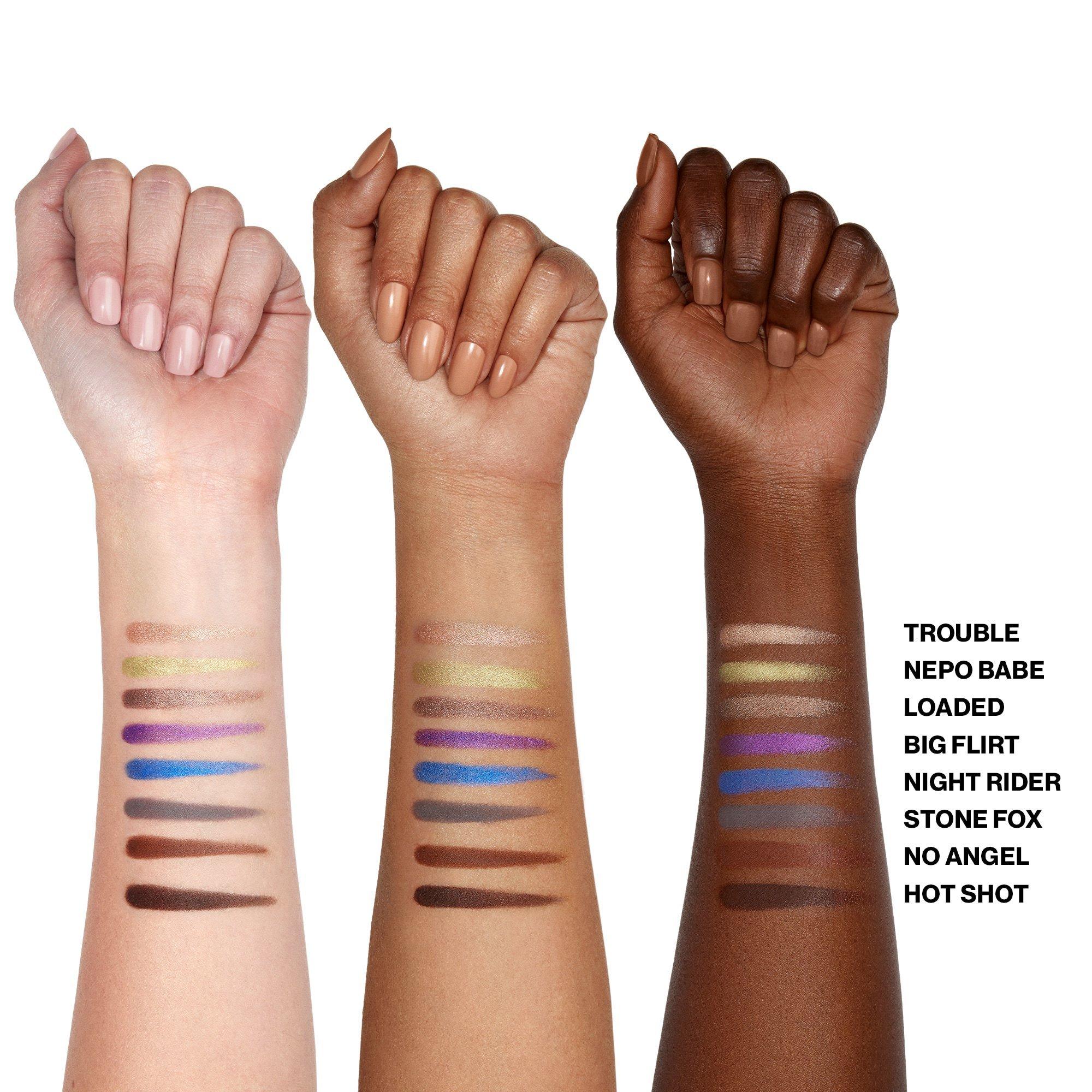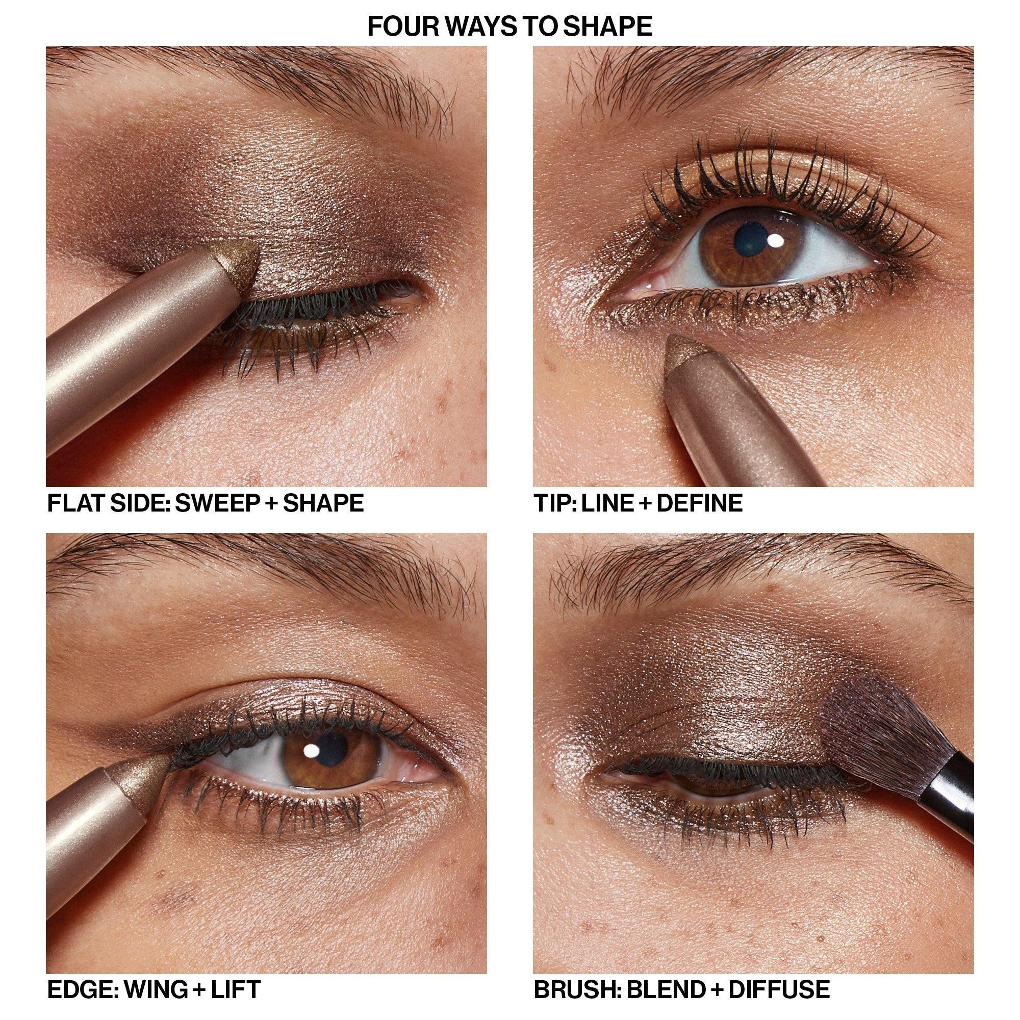 Start with clean, dry lids. Glide on a seamless wash of shadow and blend with fingers or a brush. Layer to amp up intensity. Then, trace your lash line to define and frame your eyes.