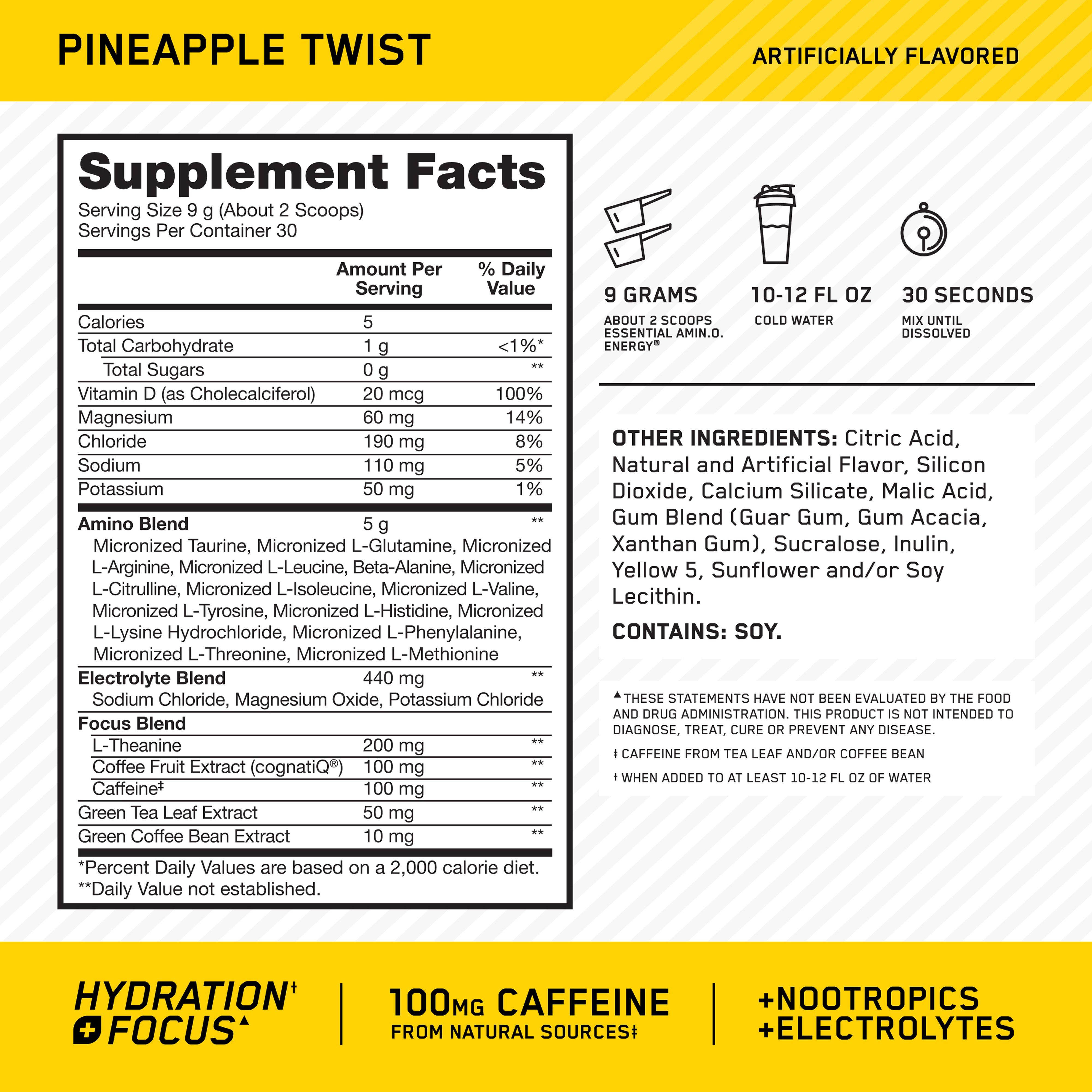 OPTIMUM NUTRITION® AMIN.O. ENERGY HYDRATION + FOCUS delivers the latest innovation to your fitness regimen. Dial up your energy, zero in on your workout, and get hydration support with our enhanced 3-in-1 formula with caffeine from natural sources, electrolytes, and nootropics in every serving.
