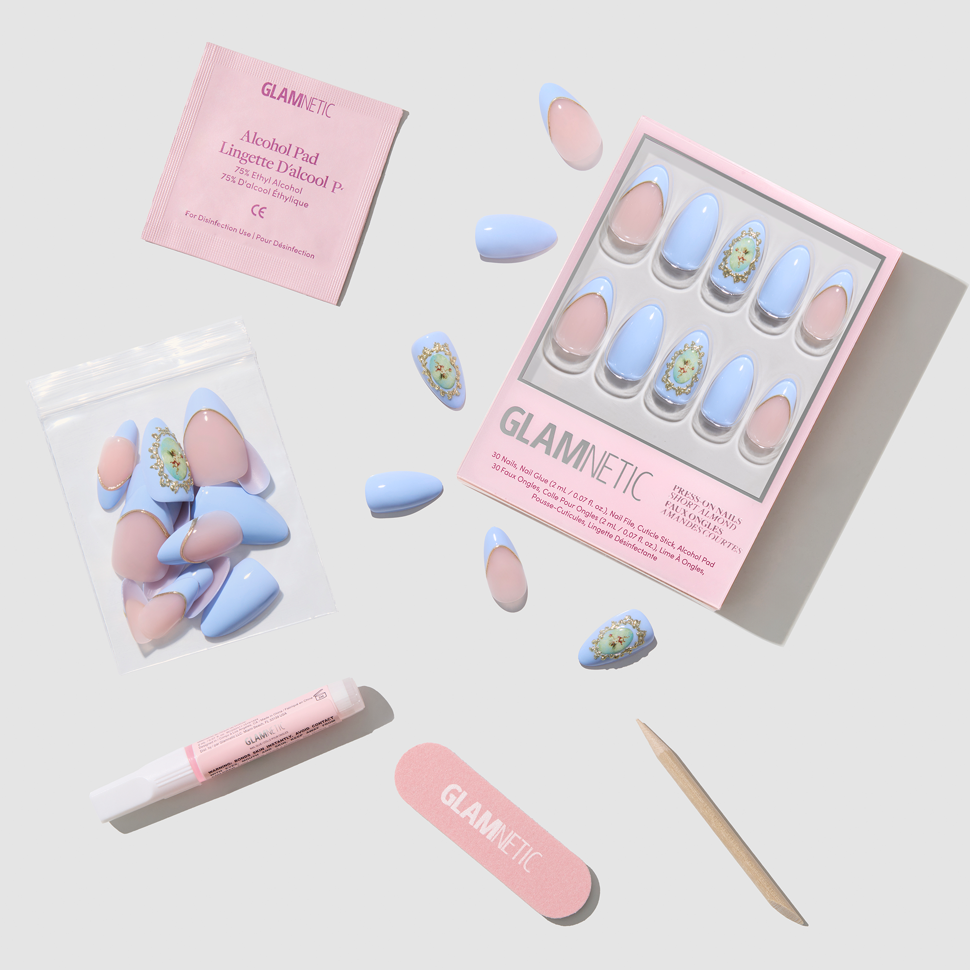 Remove any previously applied nail polish. Wash and dry hands. Gently push back cuticles using the cuticle stick and sanitize nails with alcohol pads. Size Glamnetic nails by placing on finger and select sizes best suited for your natural nails. Apply an even layer of glue to natural nails and the back of Glamnetic nails. Align Glamnetic nails with cuticle line and apply at a downward angle. Press down firmly and hold for 10-20 seconds. Apply all 10 nails and if needed, file or clip to achieve desired shape.