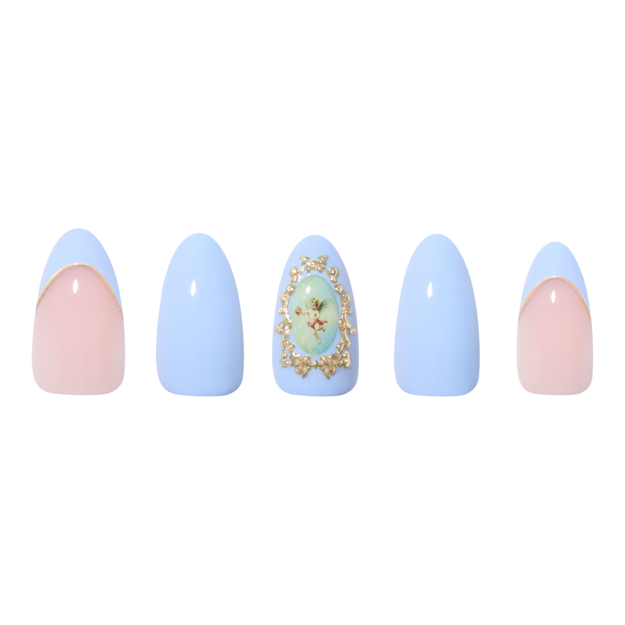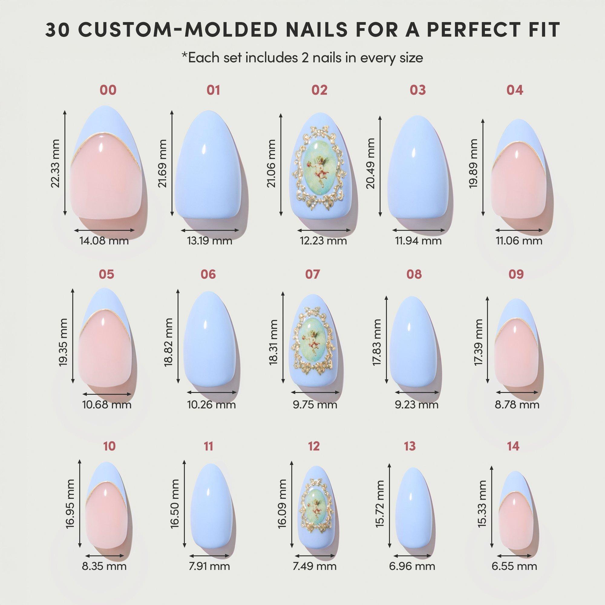 Heavenly yet bold, Angel In Blue reimagines Victorian romance in delicate powder blue solid and French tip designs, plus romance-heavy, 3D gold metallic details and cherub emblems. This style is an effortlessly ethereal mani that’s truly from above.
