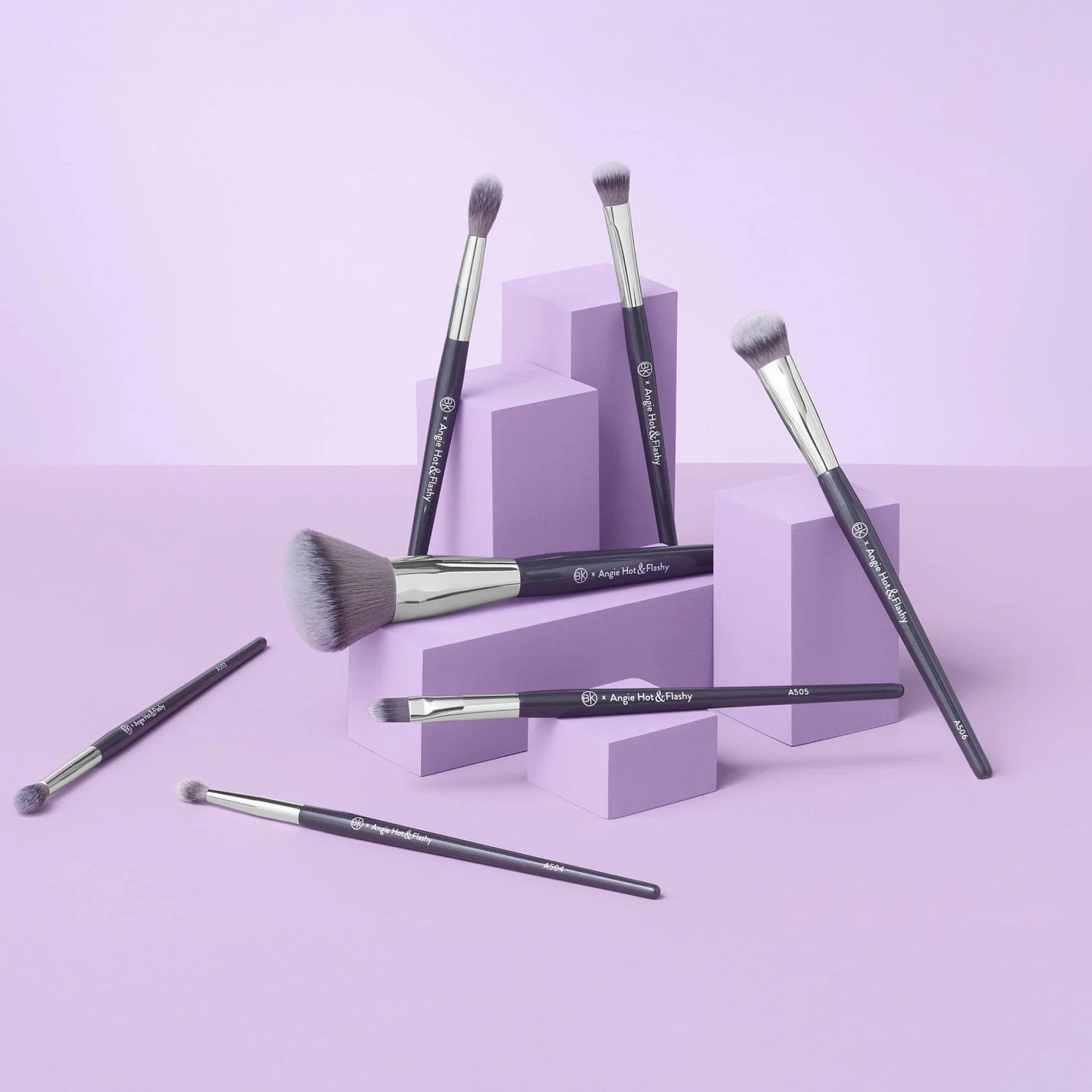 Ultra-soft 7-piece brush set from BK Beauty x Angie Hot & Flashy, tailored for mature skin. Includes five eye brushes (A501–A505) and two face brushes (A506–A507).