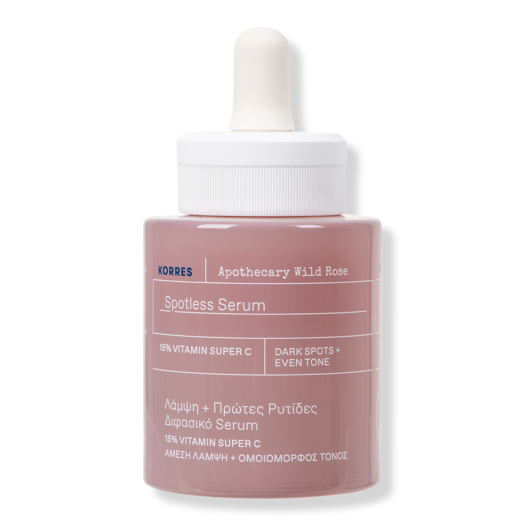 A powerful facial serum designed to erase dullness with 15% Vitamin Super C, the KORRES Apothecary Wild Rose Spotless Serum reduces the appearance of dark spots and skin discolorations for a glowing, even skin tone.