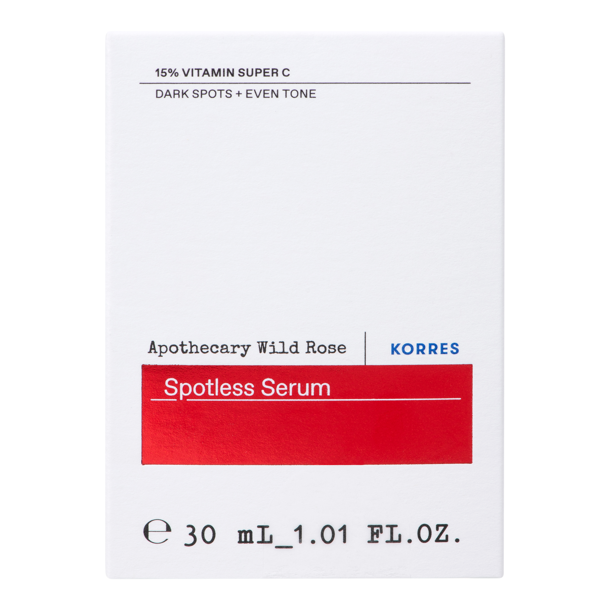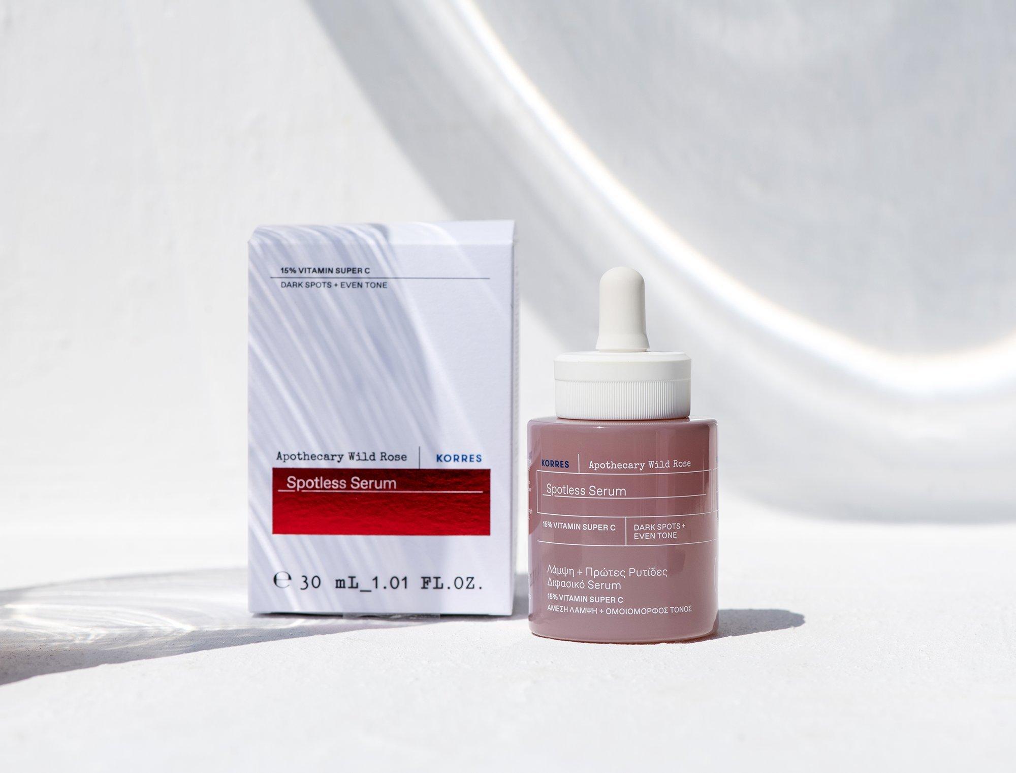 A powerful facial serum designed to erase dullness with 15% Vitamin Super C, the KORRES Apothecary Wild Rose Spotless Serum reduces the appearance of dark spots and skin discolorations for a glowing, even skin tone.