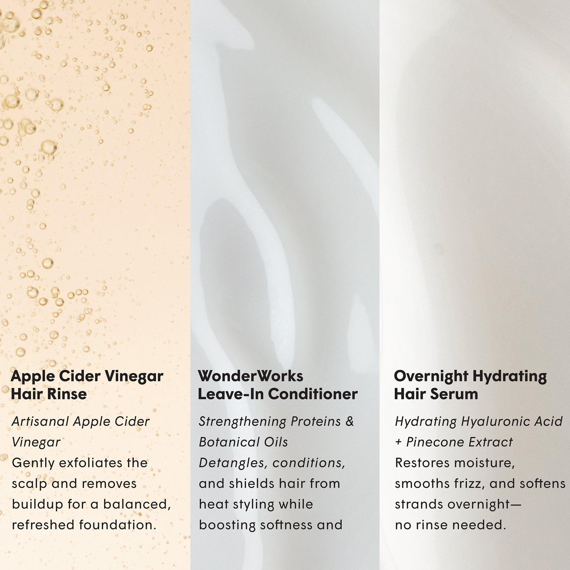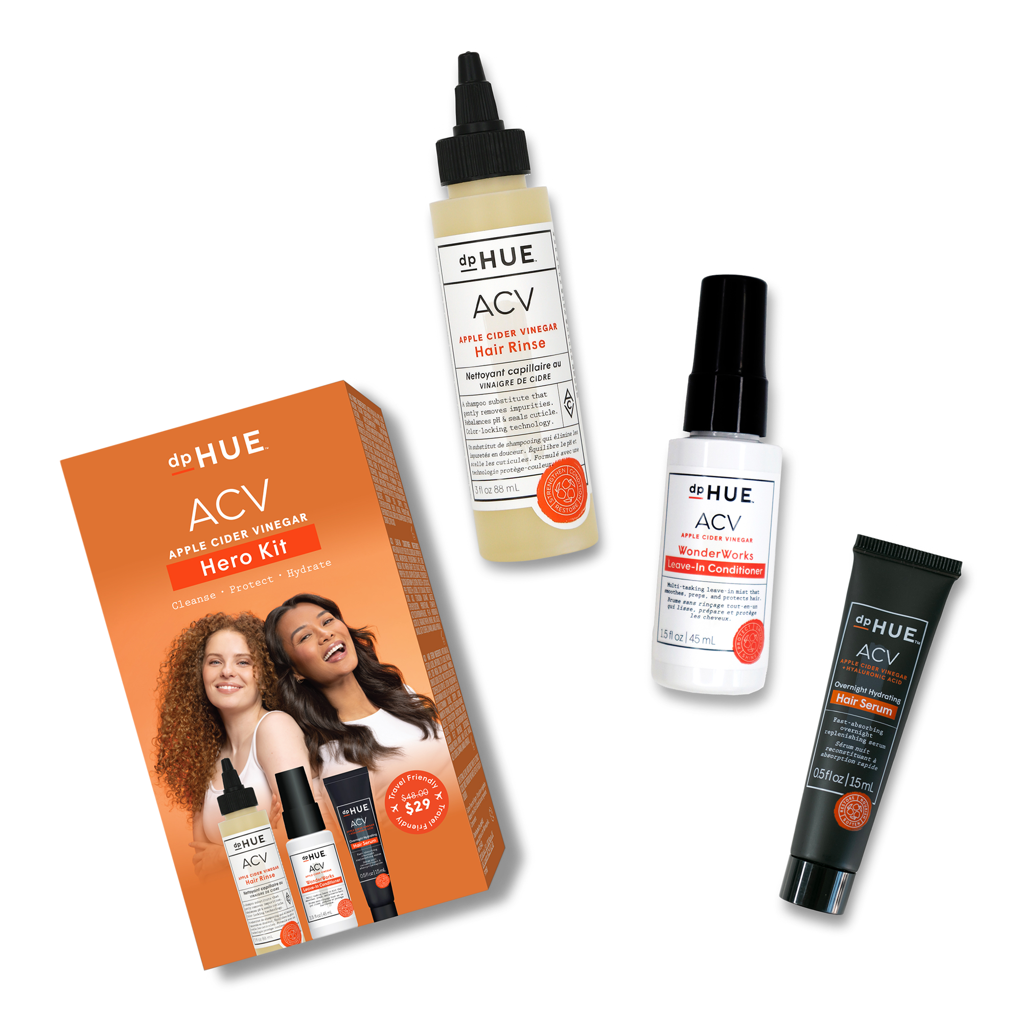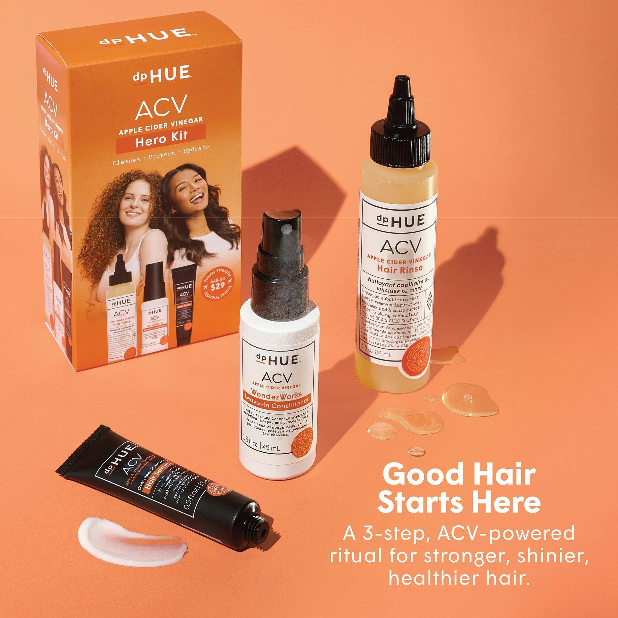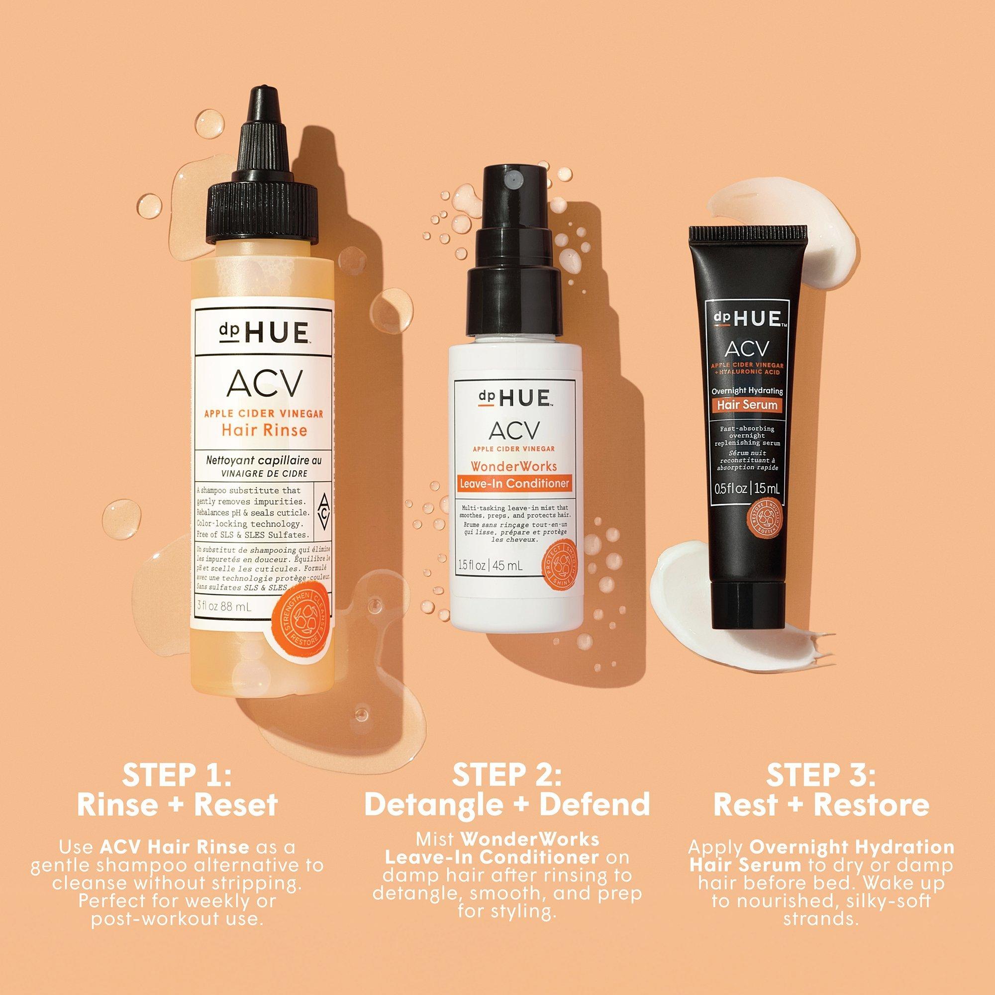 dpHUE travel-friendly trio to cleanse, detangle, and deeply hydrate. Includes ACV Rinse, Leave-In Conditioner, and Overnight Serum for healthy, balanced hair anywhere.