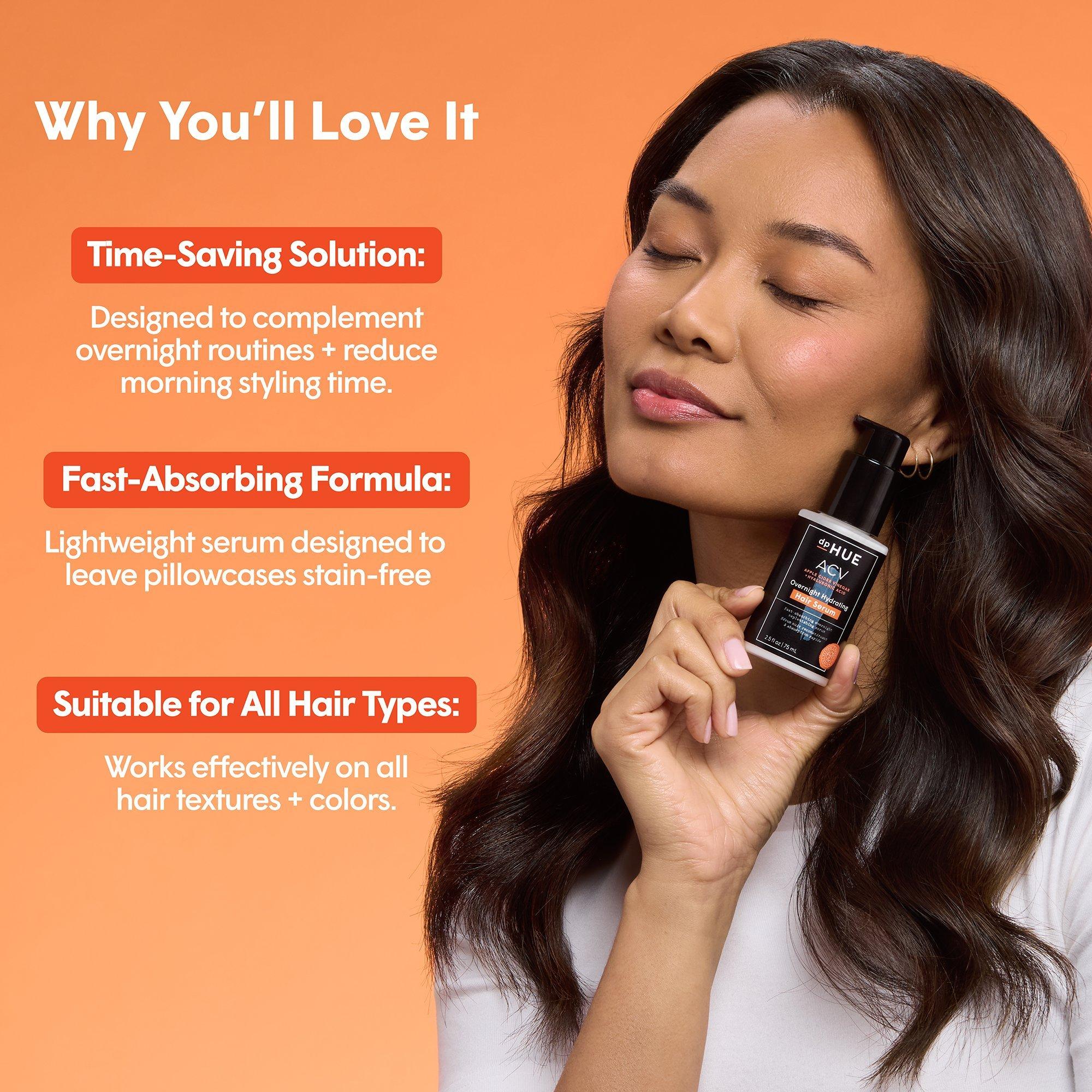 dpHUE's Apple Cider Vinegar Overnight Hydrating Hair Serum is a fast-absorbing, restorative serum that hydrates overnight for softer, more manageable hair. Helps reduce frizz and tangles.