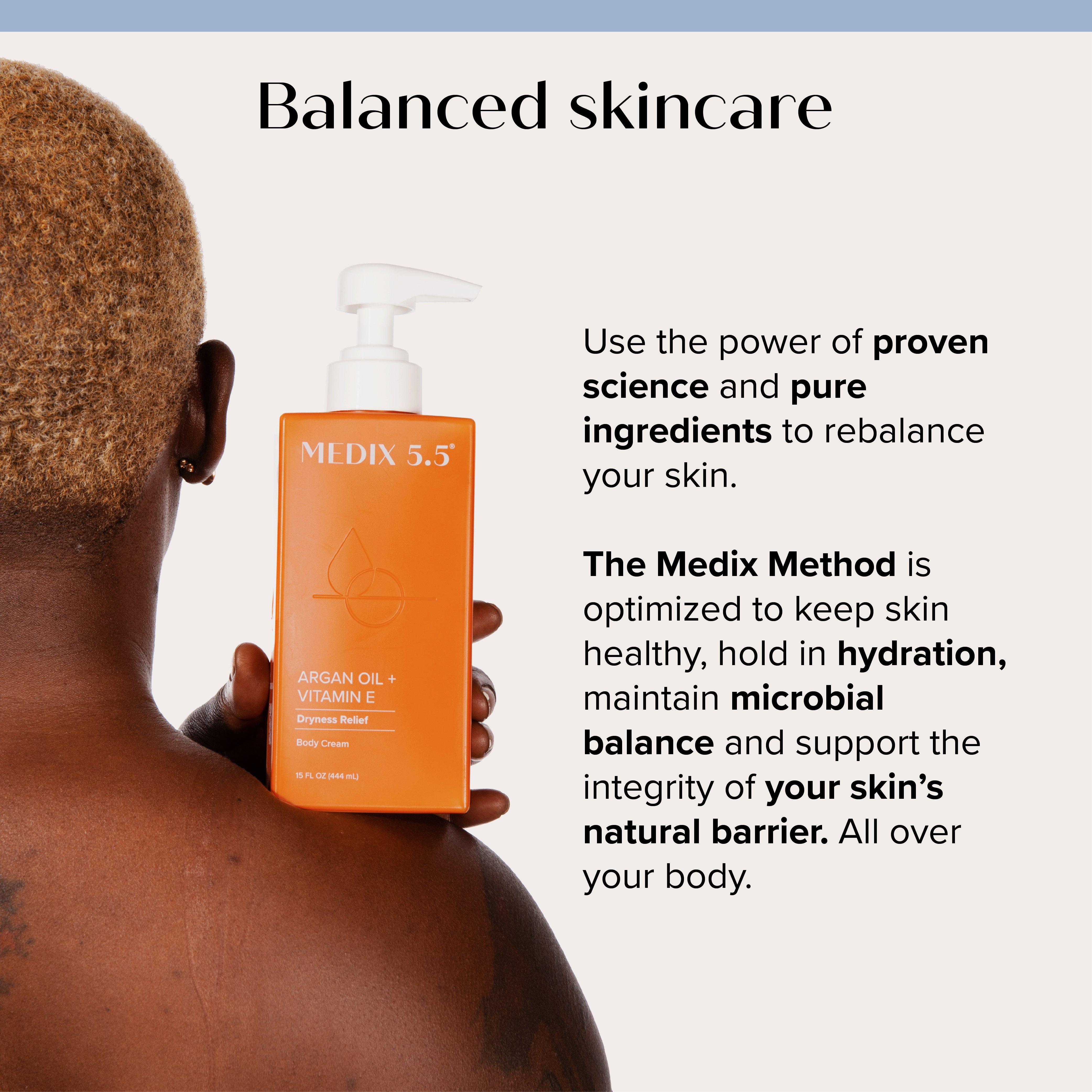 Massage body cream over your skin daily. For a complete regimen, start with your favorite Medix 5.5 body wash and follow with our targeted body creams and serums for targeted benefits.