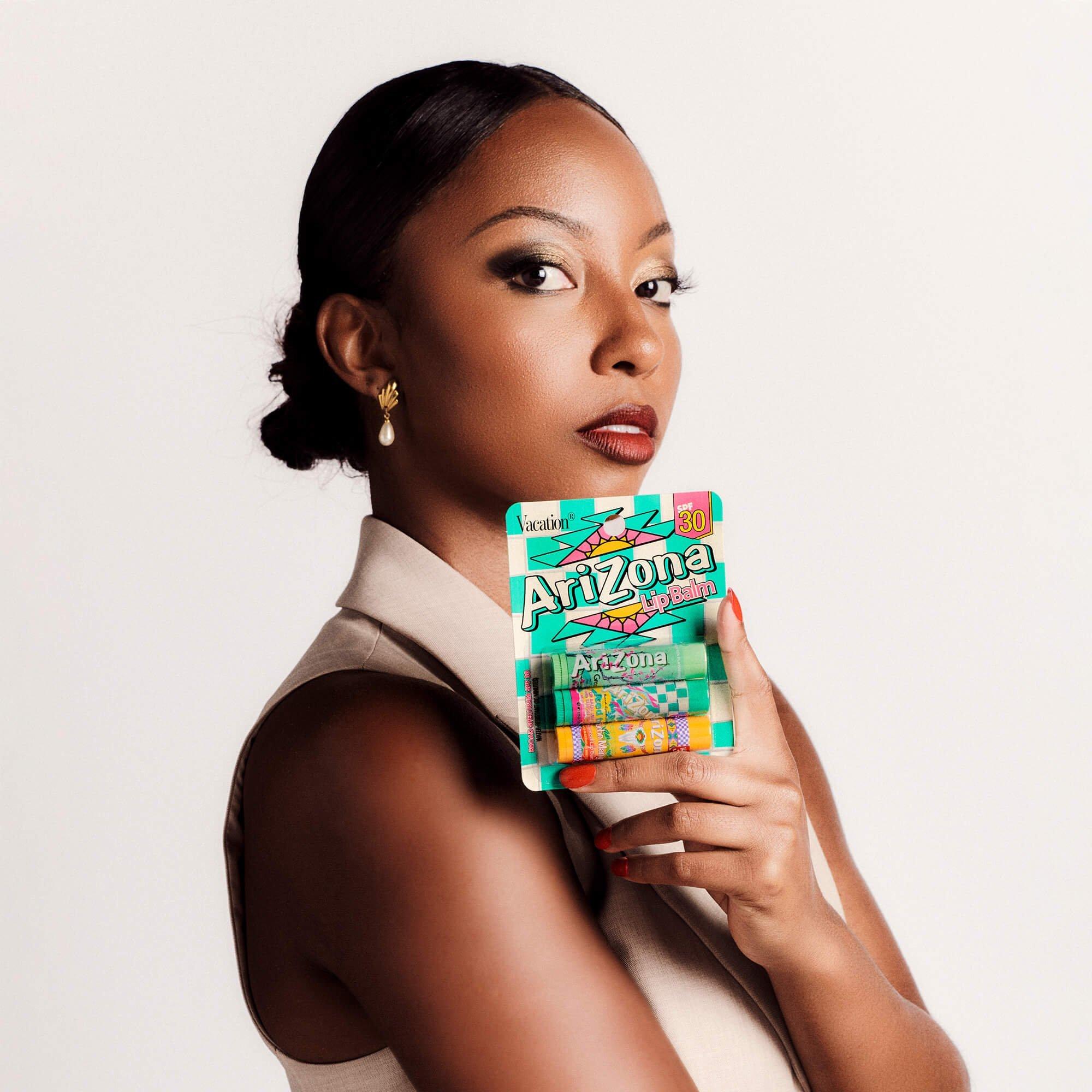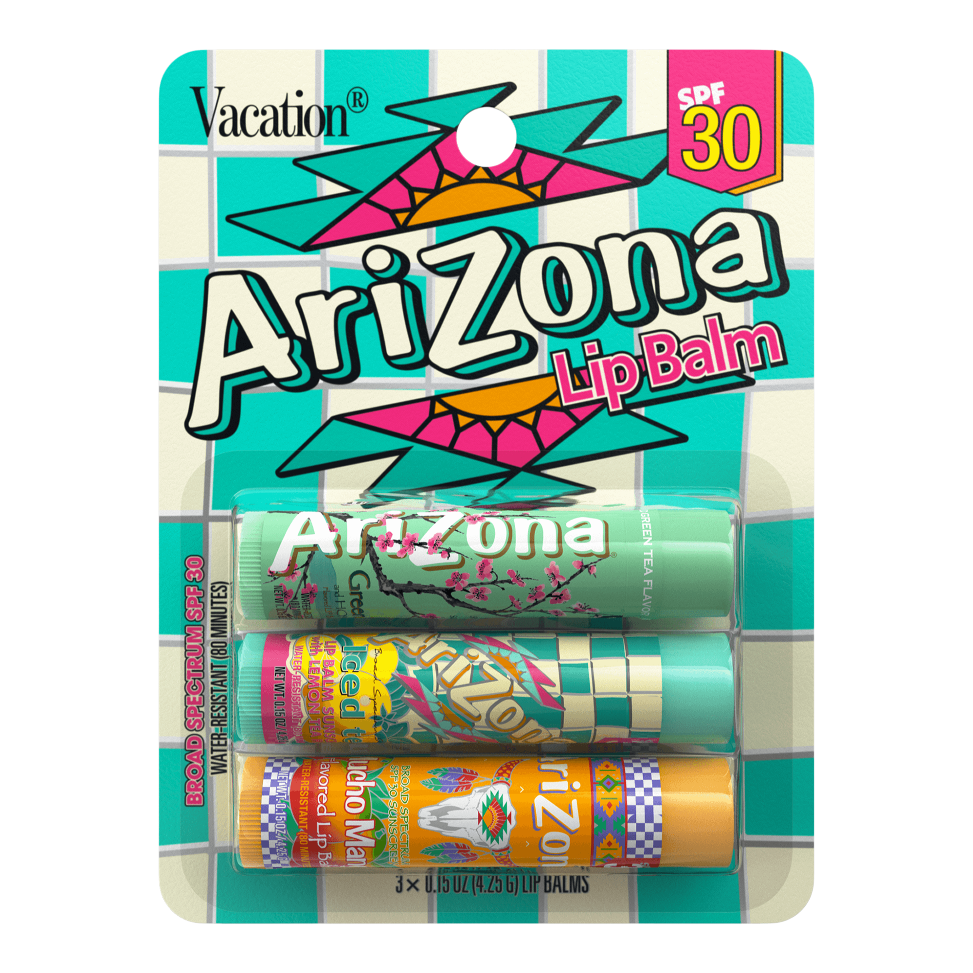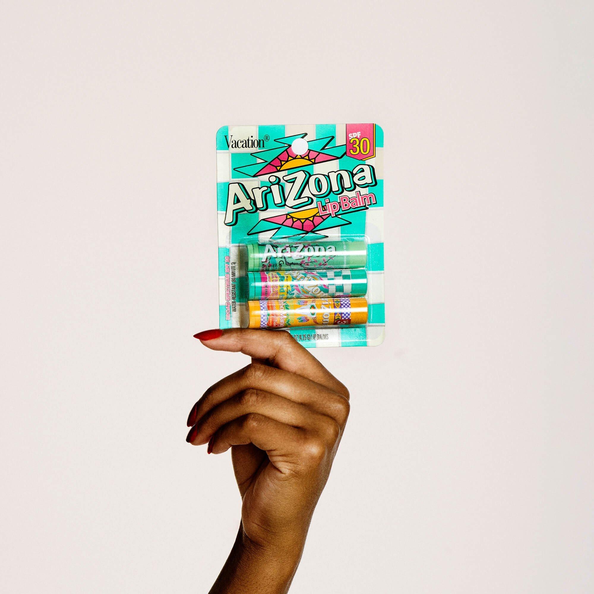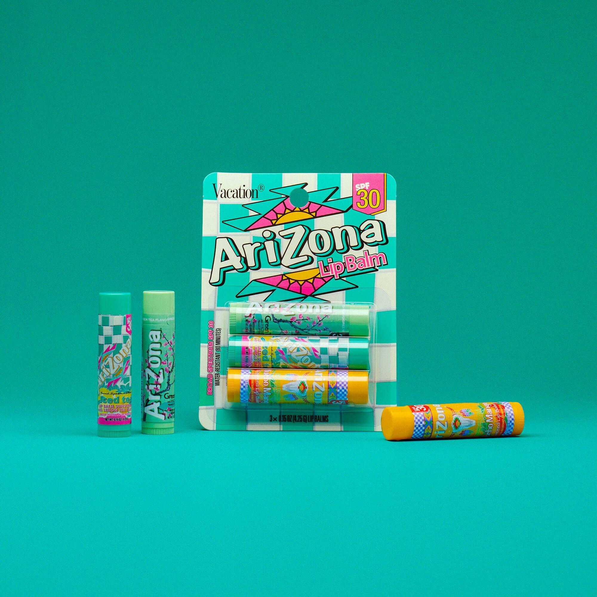 Experience the great taste of AriZona Iced Tea in Vacation SPF 30 Lip Balm form. Enjoy three of their iconic flavors: "Mucho Mango," "Green Tea with Ginseng & Honey," and "Iced Tea with Lemon," combined with the best in broad spectrum protection, lip nourishment, and hydration.
