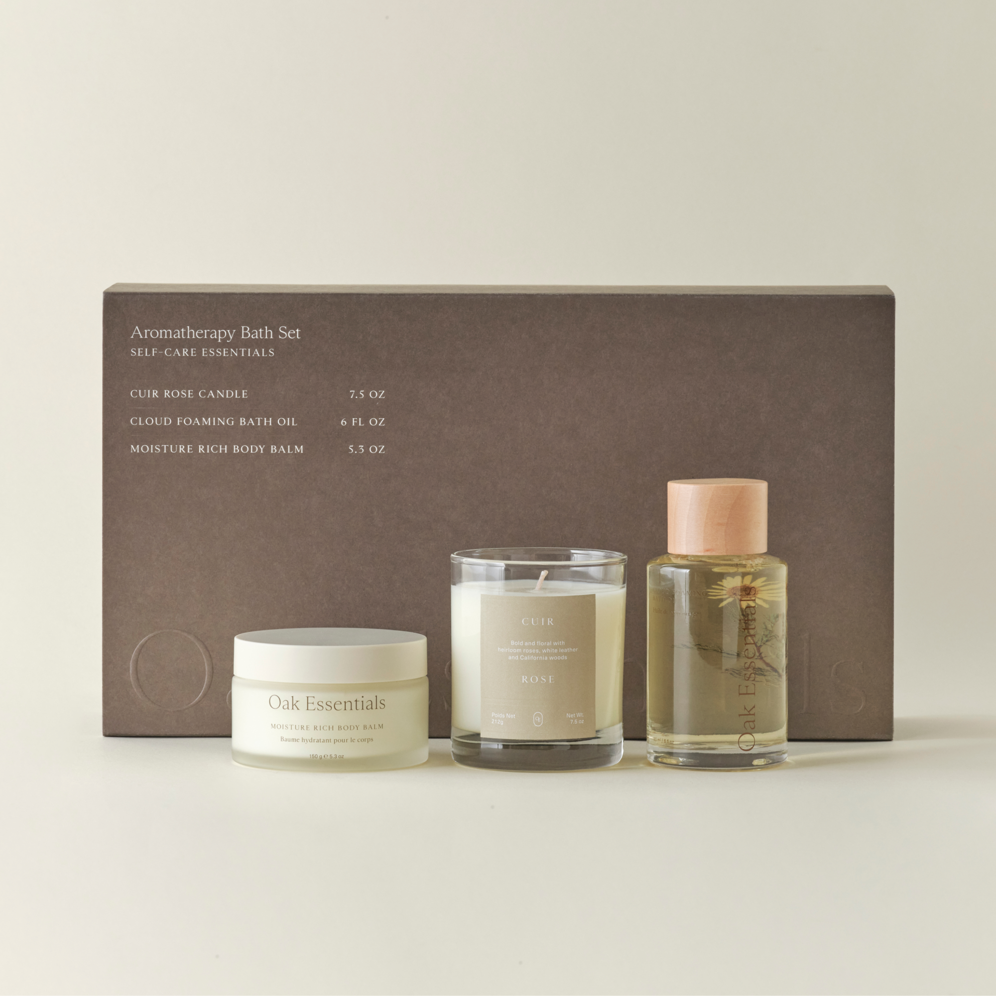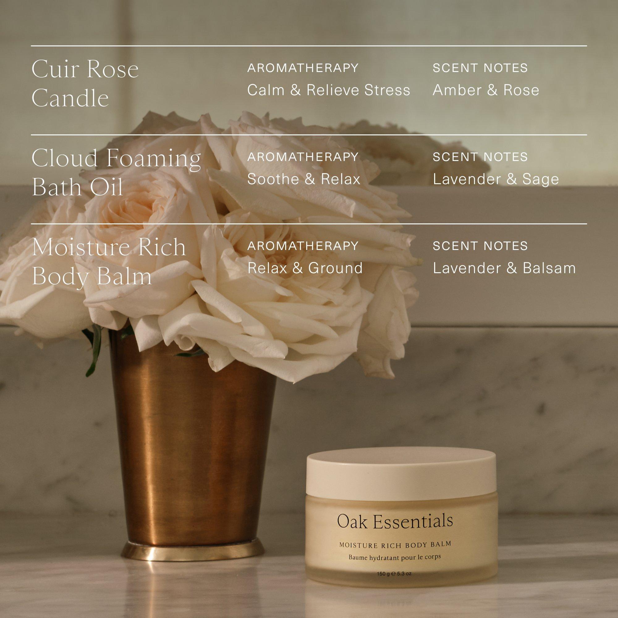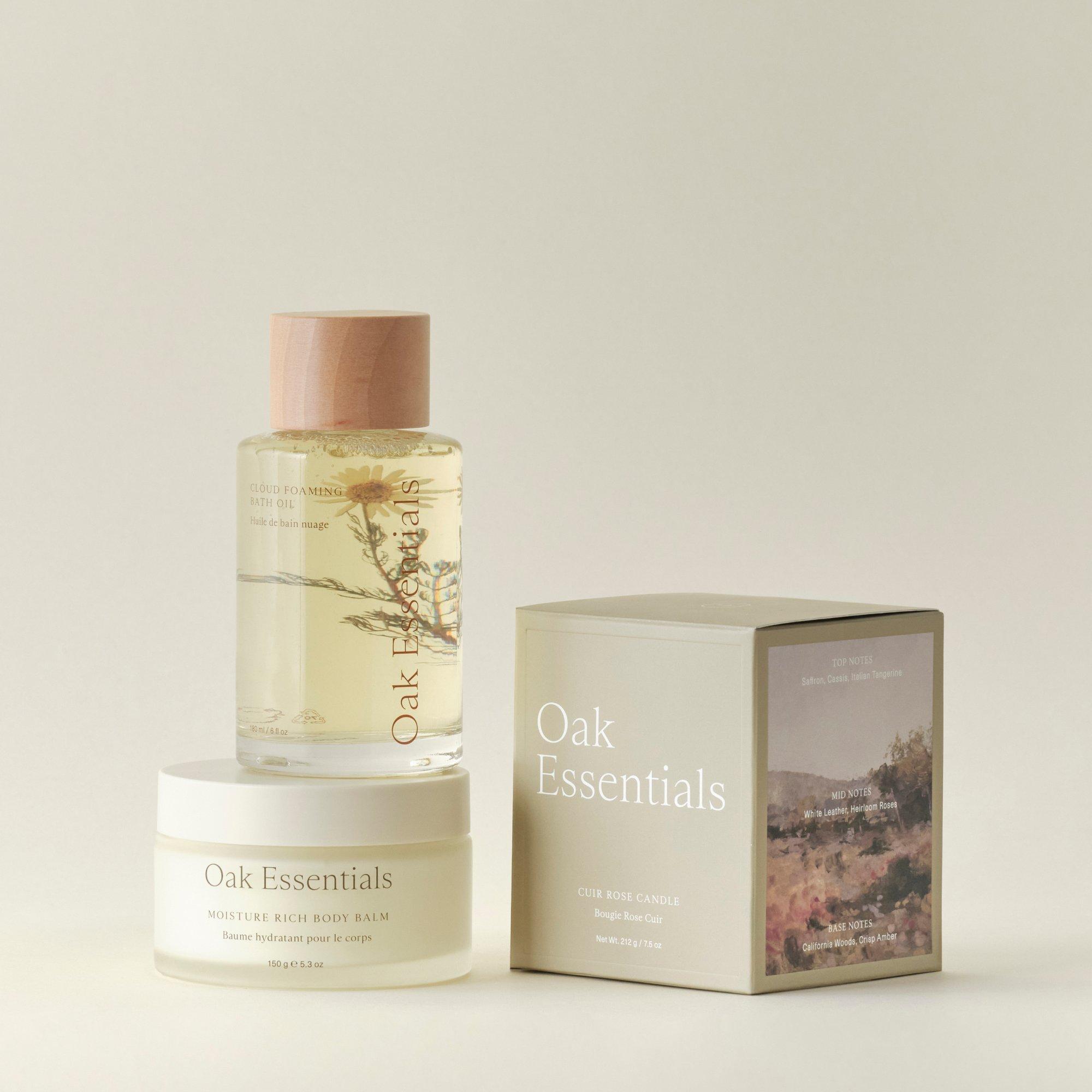 Oak Essentials curated the Aromatherapy Bath Set carefully selecting each essential for its luxurious aromatherapy and deeply soothing benefits. Inside, you’ll find a bubbling bath oil, a mood-enhancing candle, and a richly hydrating body balm—just start filling your tub and get ready to unwind.