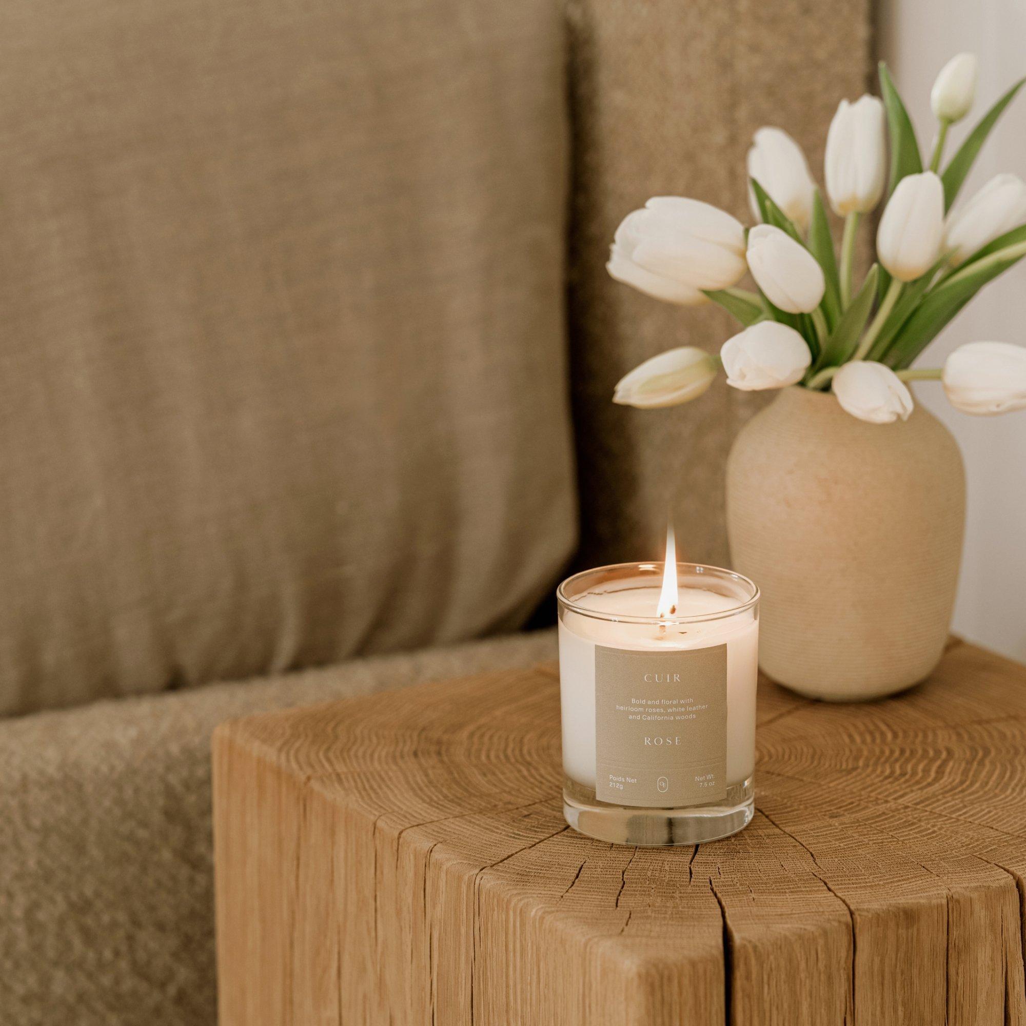 Cuir Rose Candle - Trim wick to 1/4' before each burn. Never leave candles unattended, and don't burn for more than 4 hours at a time. When 1/4' of unmelted wax remains, discontinue use.