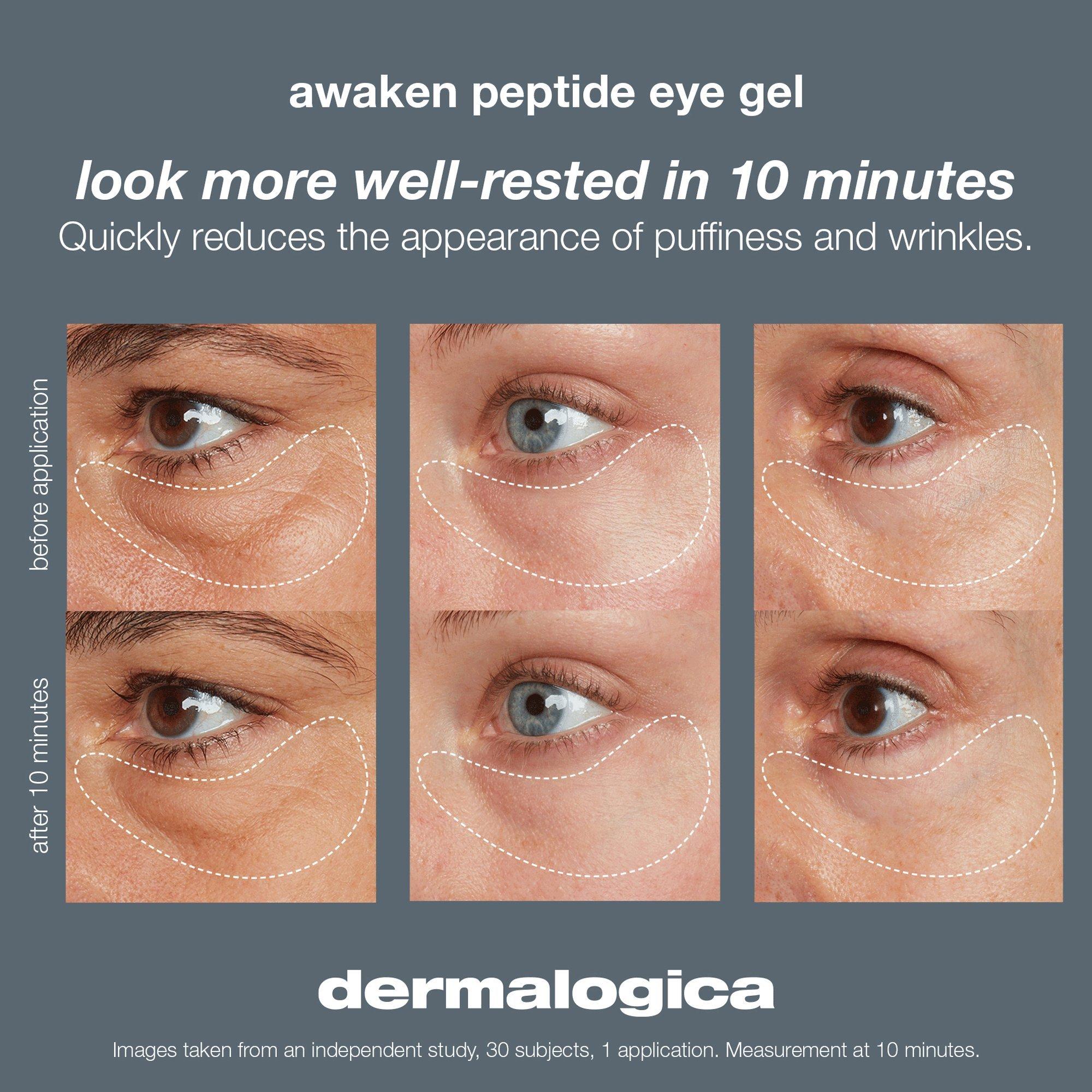 Dermalogica's Awaken Peptide Eye Gel minimizes the appearance of fine lines and puffiness over time. A powerful blend of caffeine and highly active peptides helps to decrease the appearance of tired, puffy eye bags and helps you fake a full night's sleep.