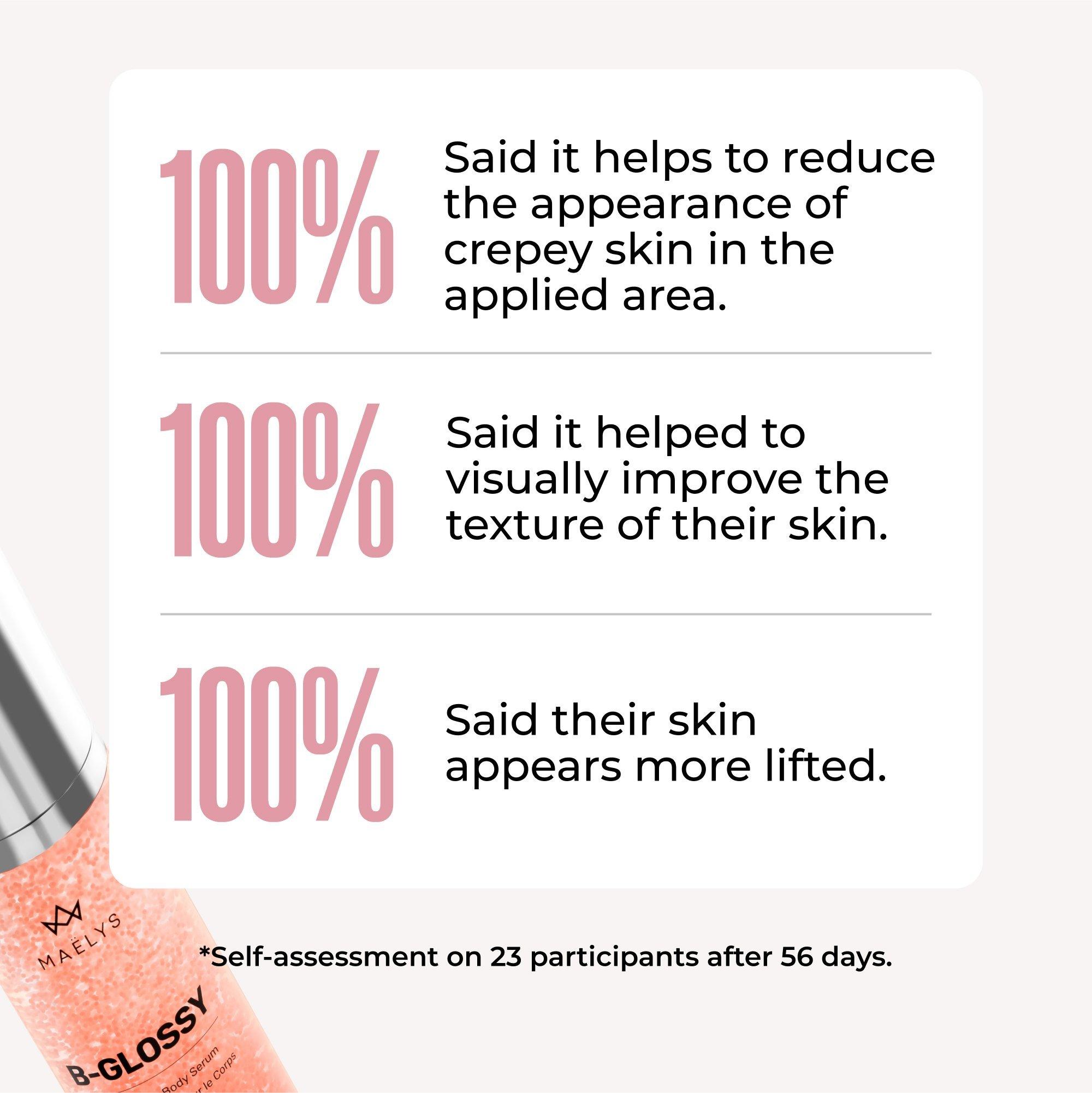 MAËLYS B-GLOSSY Smoothing Body Serum tackles the visible signs of aging by reducing the appearance of fine lines and wrinkles, making the skin look firmer and more radiant. Each bottle is packed with over 12,000 drops of a combination of Meadowfoam Oil & powerful peptides to help lock in moisture.