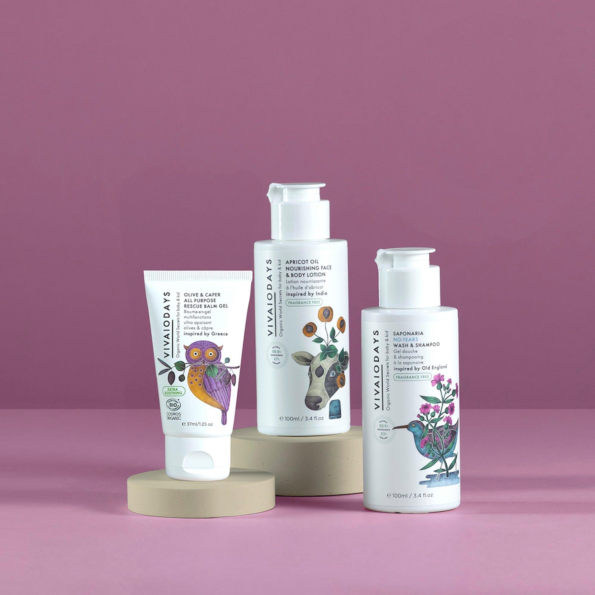 A fragrance-free gift set of baby essentials for sensitive skin, featuring a soap-free wash & no-tears shampoo, nourishing face & body lotion, and an extra-soothing rescue balm gel, all in an FSC-certified reusable box. Dermatologist tested and inspired by time-honored remedies.