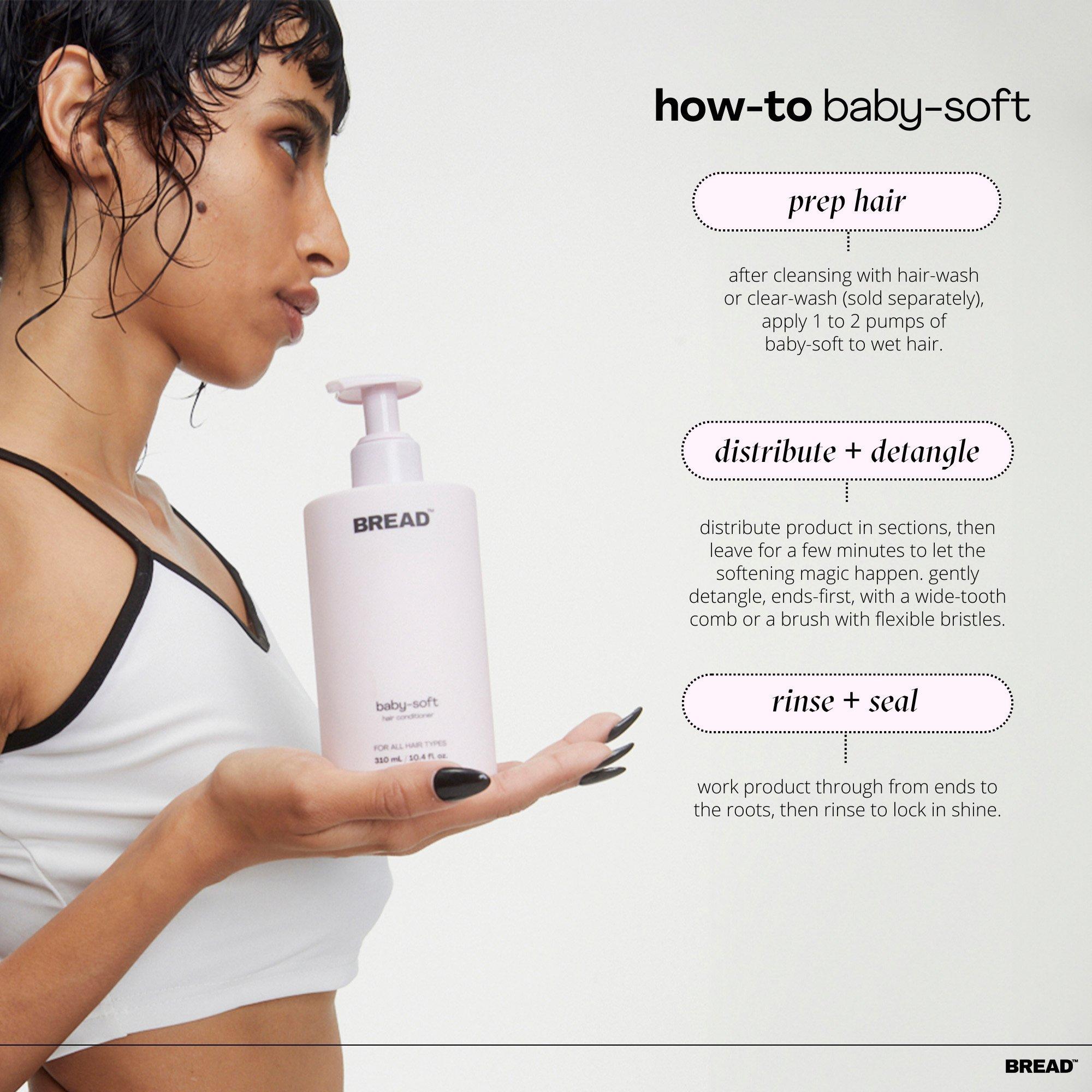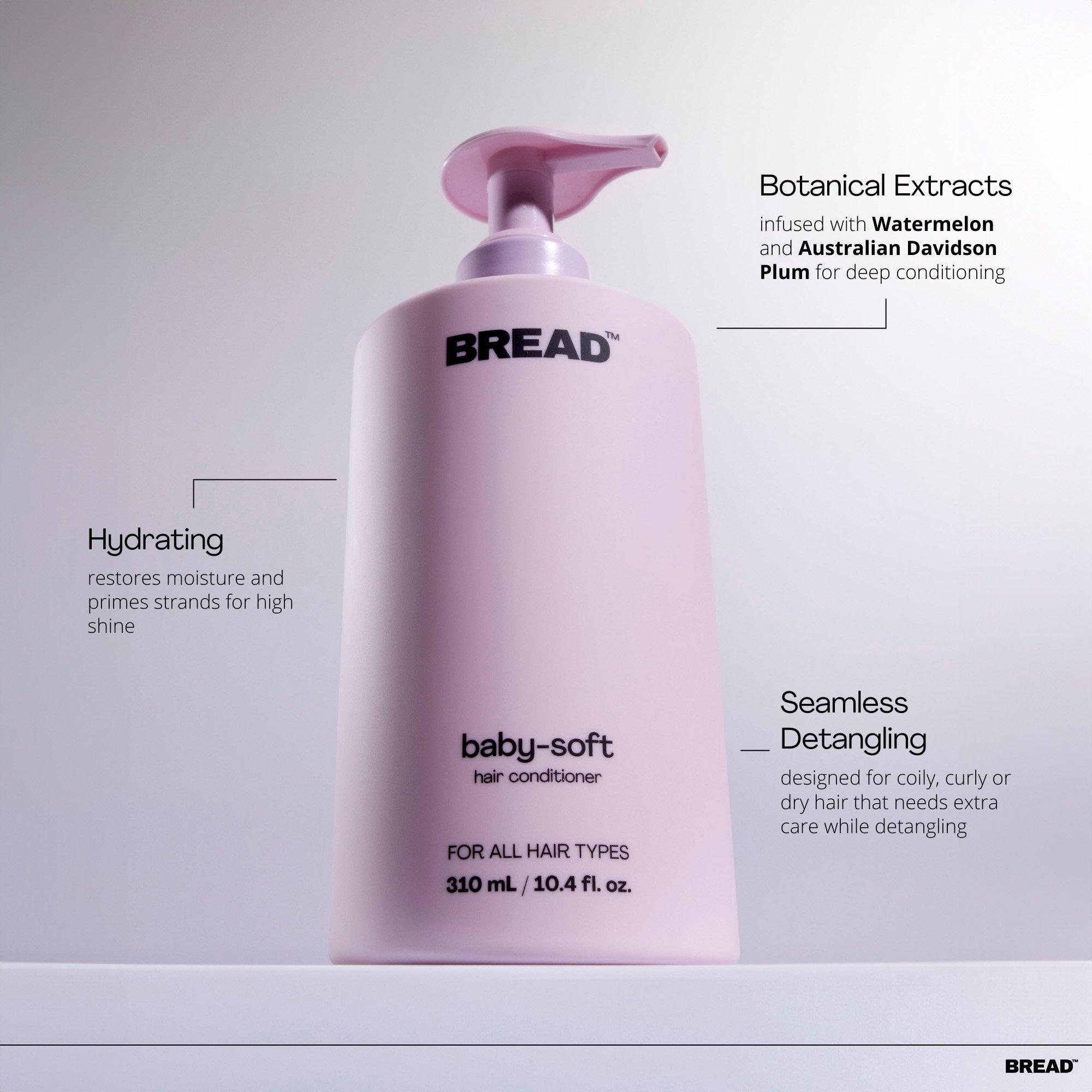 Bread Beauty Supply's Baby-Soft: Hair Conditioner is a silky-soft 'always on' hair conditioner designed to prime strands for seamless detangling, high shine, and velvet softness.