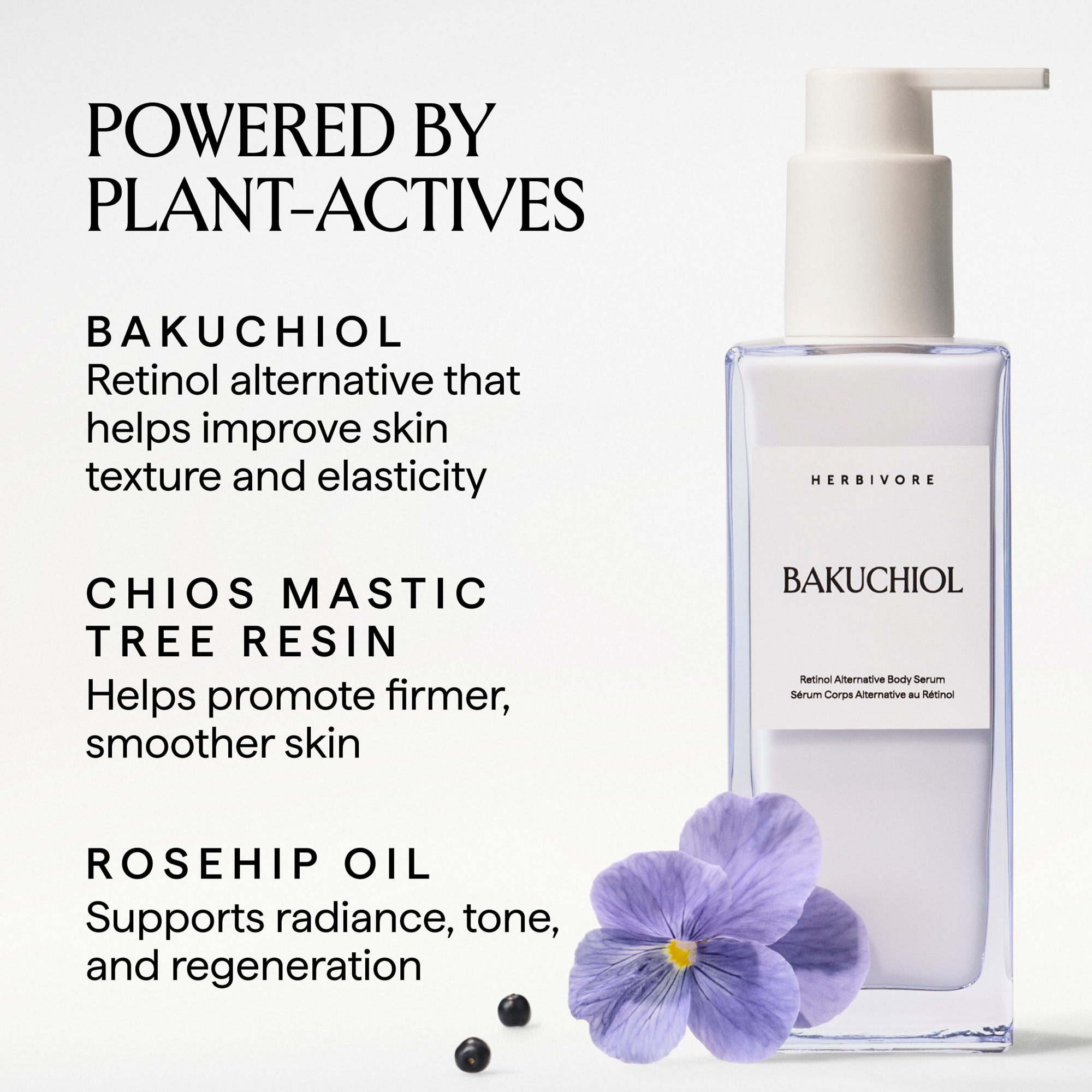 HERBIVORE BAKUCHIOL Retinol Alternative Body Serum helps to hydrate and visibly smooth skin, with bakuchiol, rosehip oil, and vitamin E.