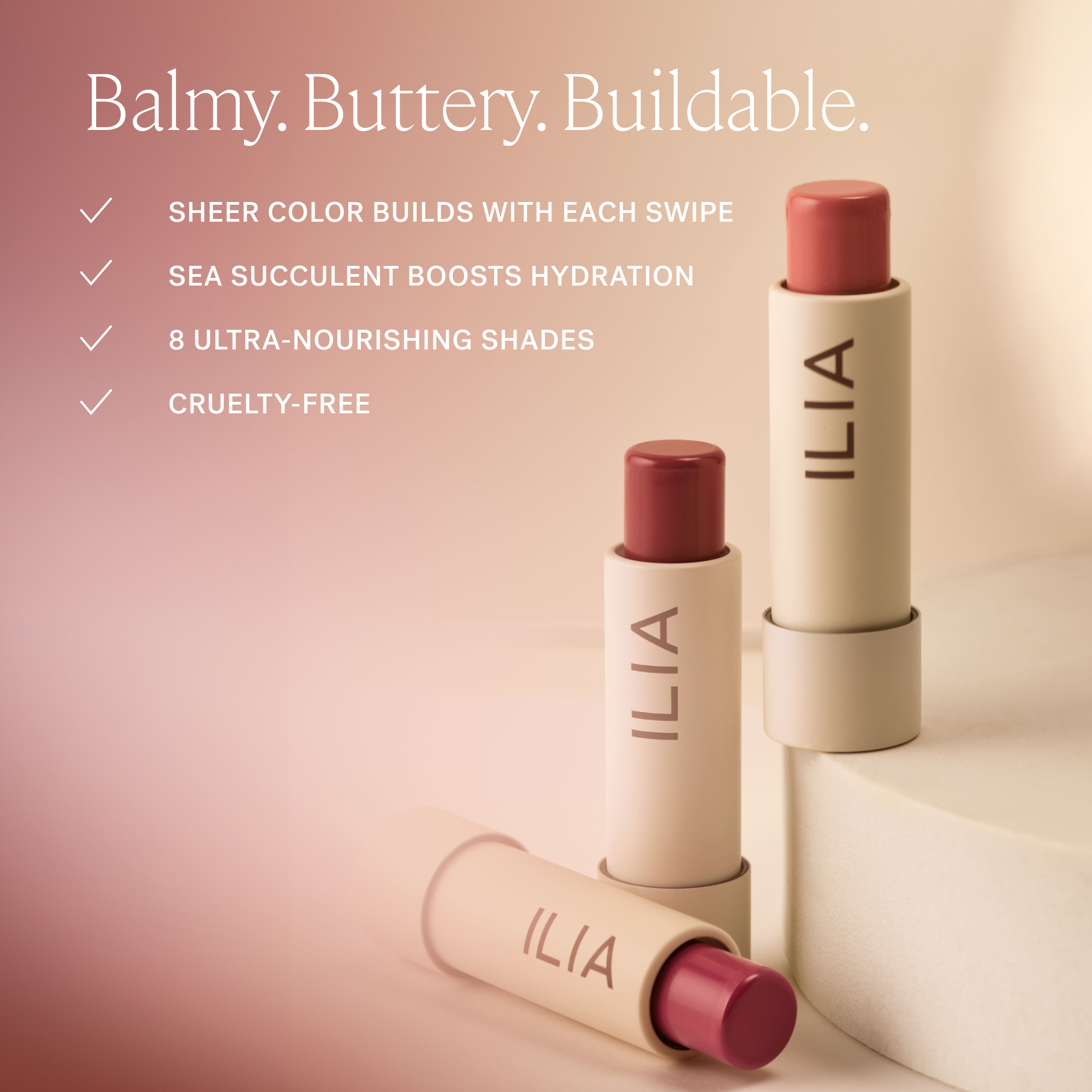 ILIA Balmy Tint Hydrating Lip Balm is a clean tinted lip balm with potent levels of moisture-boosting ingredients and sheer, buildable color.
