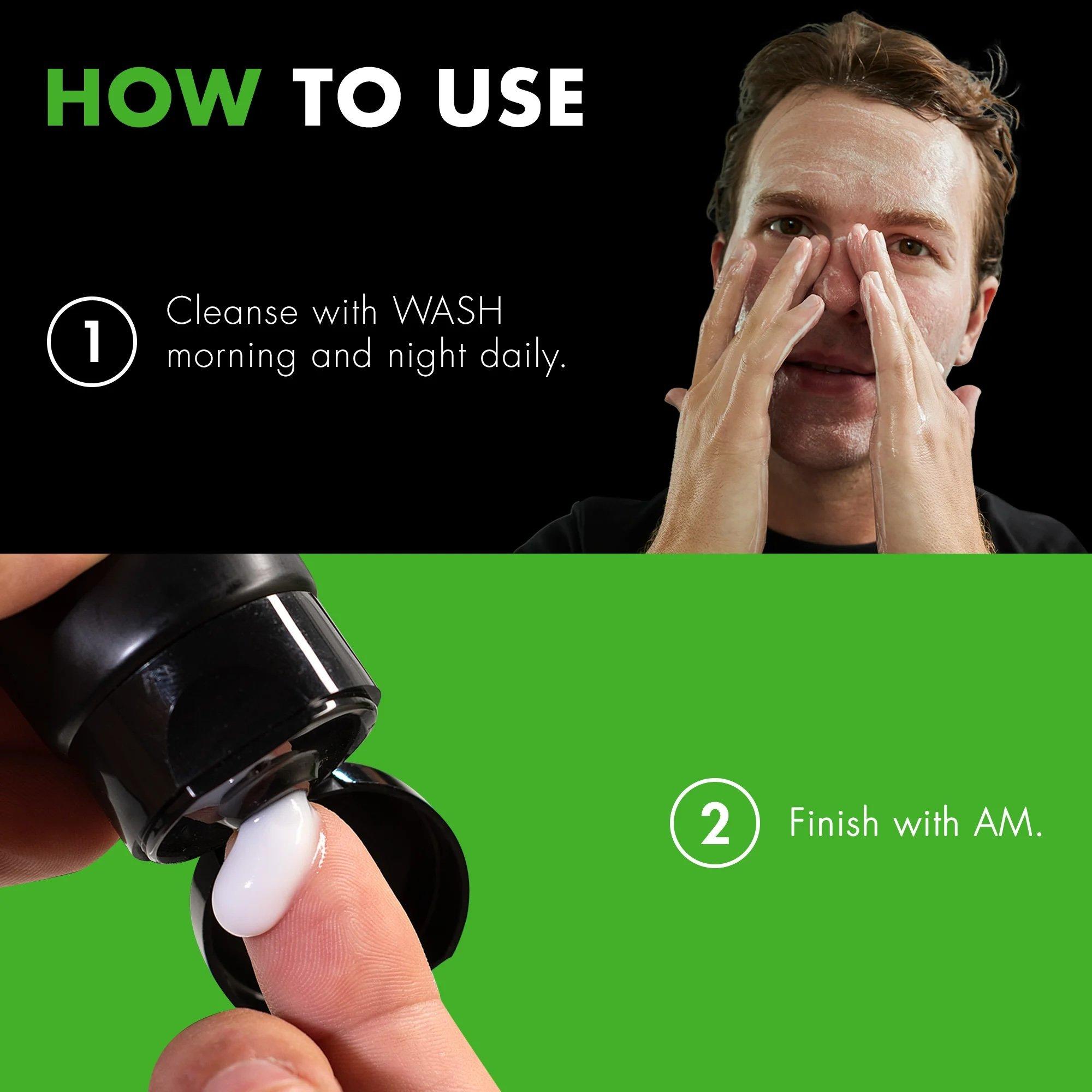 Look and feel amazing with a 30-day supply of our two hero products designed to work together for your simplest skin care routine. WASH gently foams to remove dirt and excess oil. AM moisturizes while providing SPF 20 sun protection.