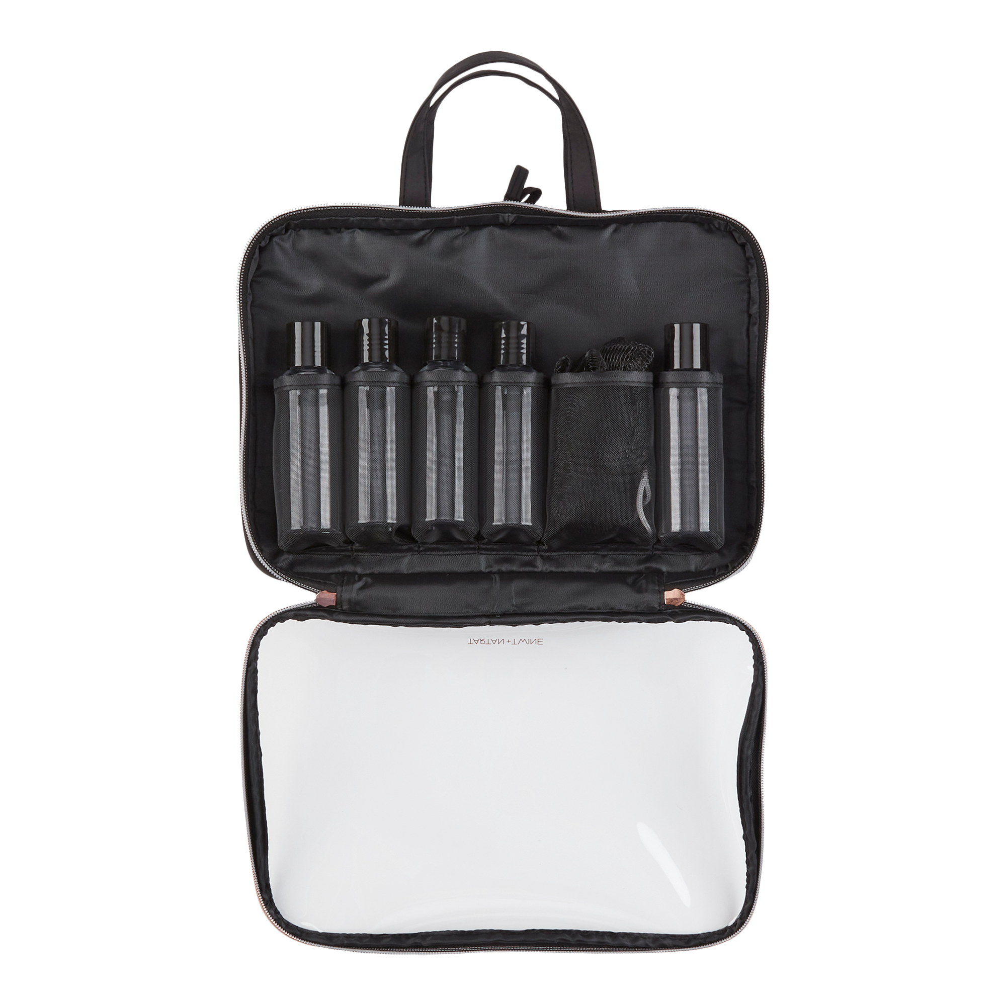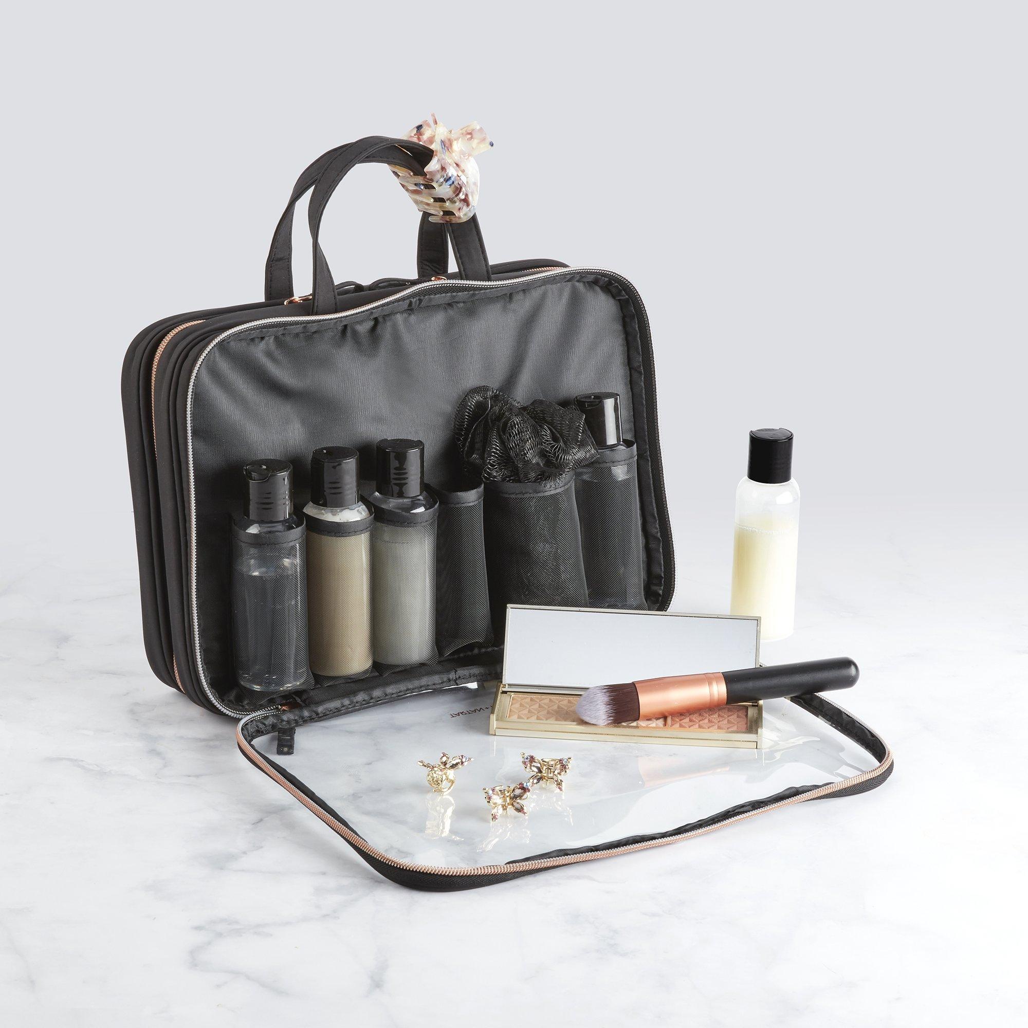 Packing just got a lot easier. This Tartan + Twine Basics Black Weekender bag’s spacious main compartment holds your toiletry collection. Five travel bottles hold all your liquids.