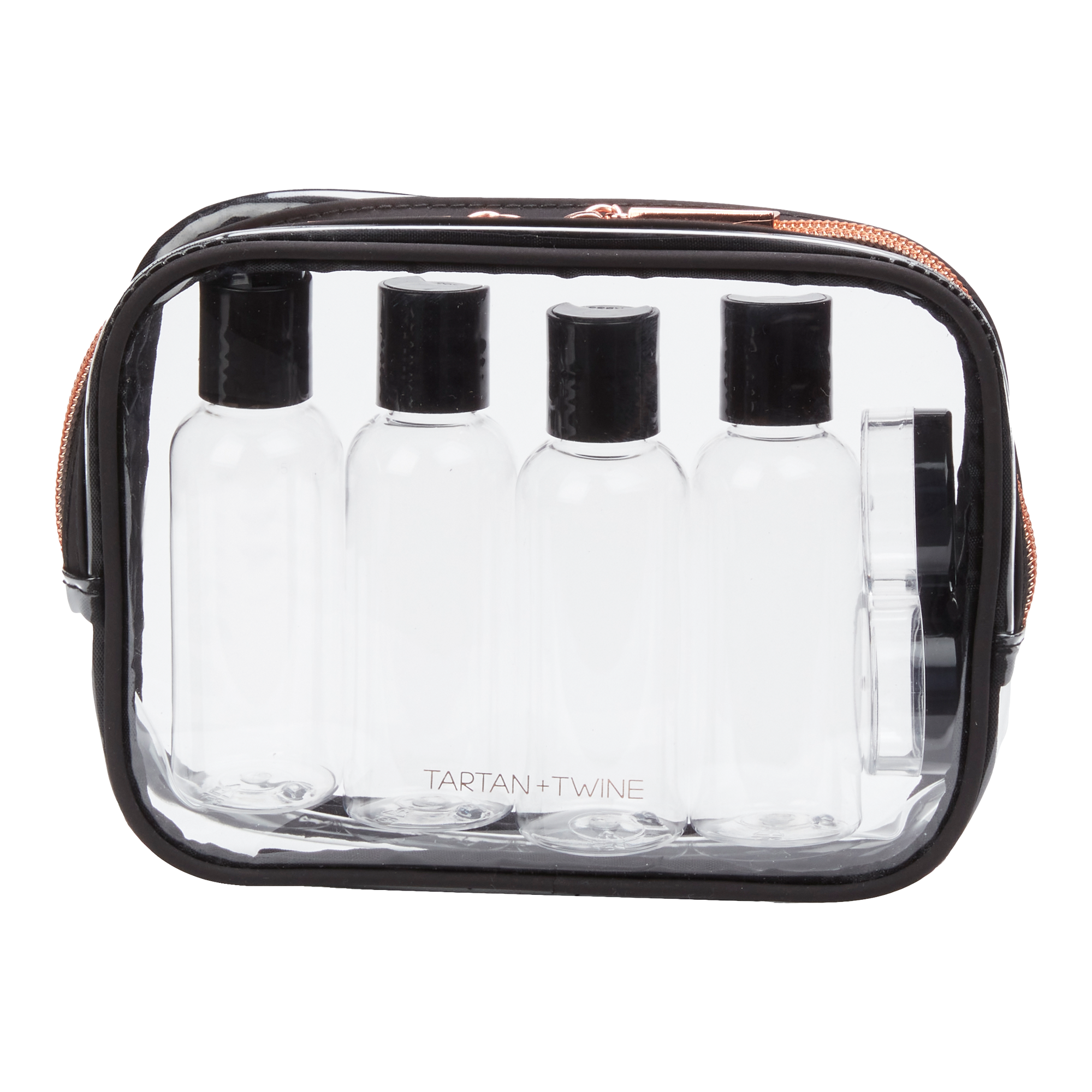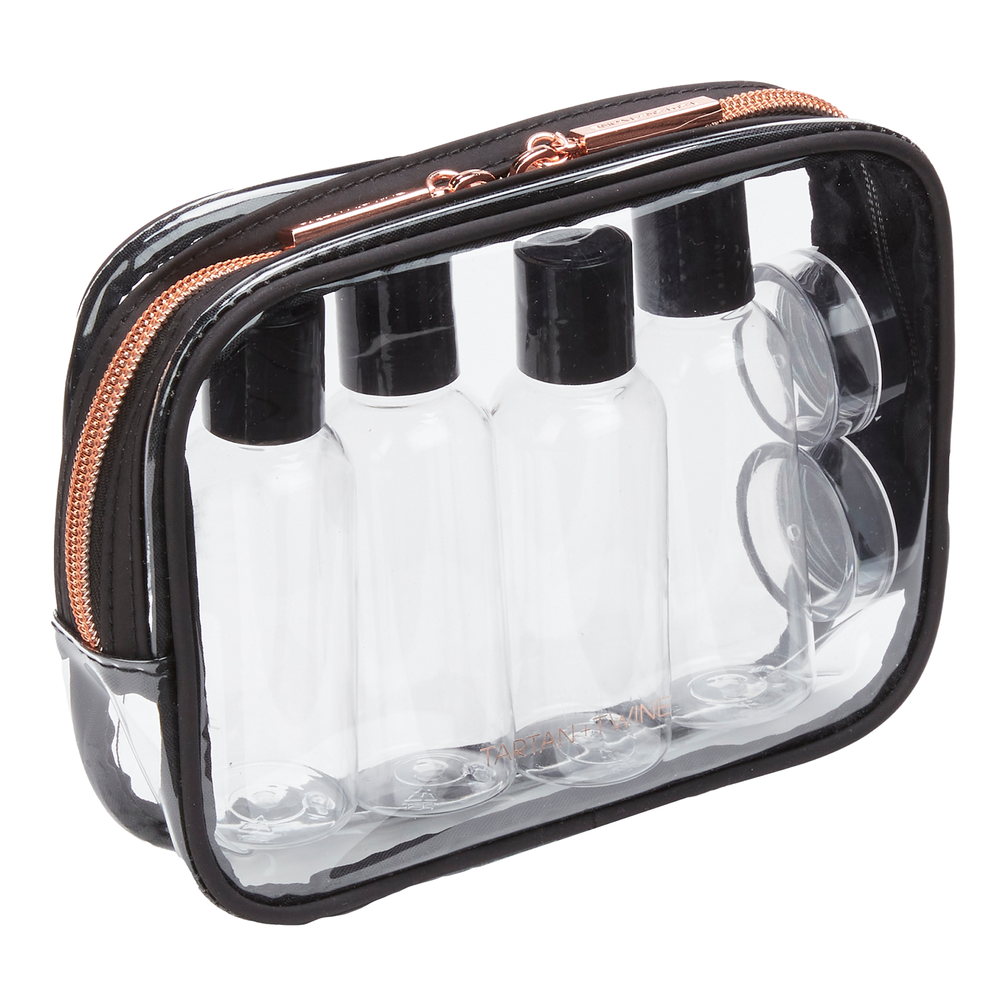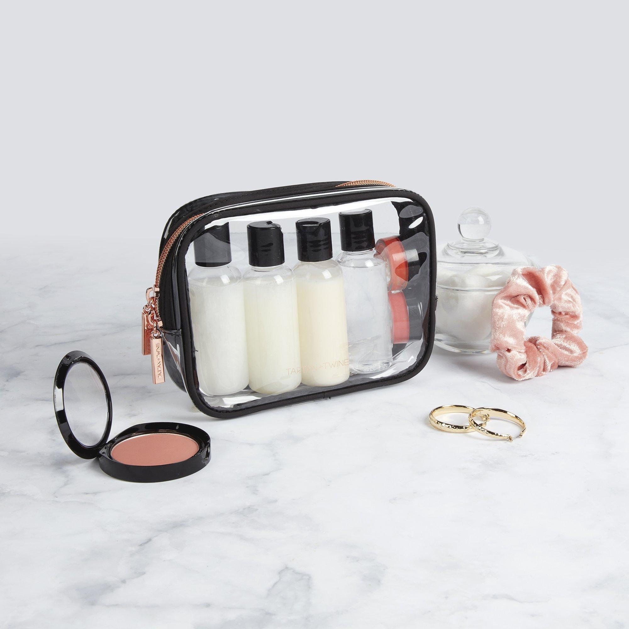 This Tartan + Twine Basics Clear Organizer is a travel staple. Its compact main compartment holds toiletries and cosmetics. Includes 4 travel bottles and 2 jars for liquids and creams.