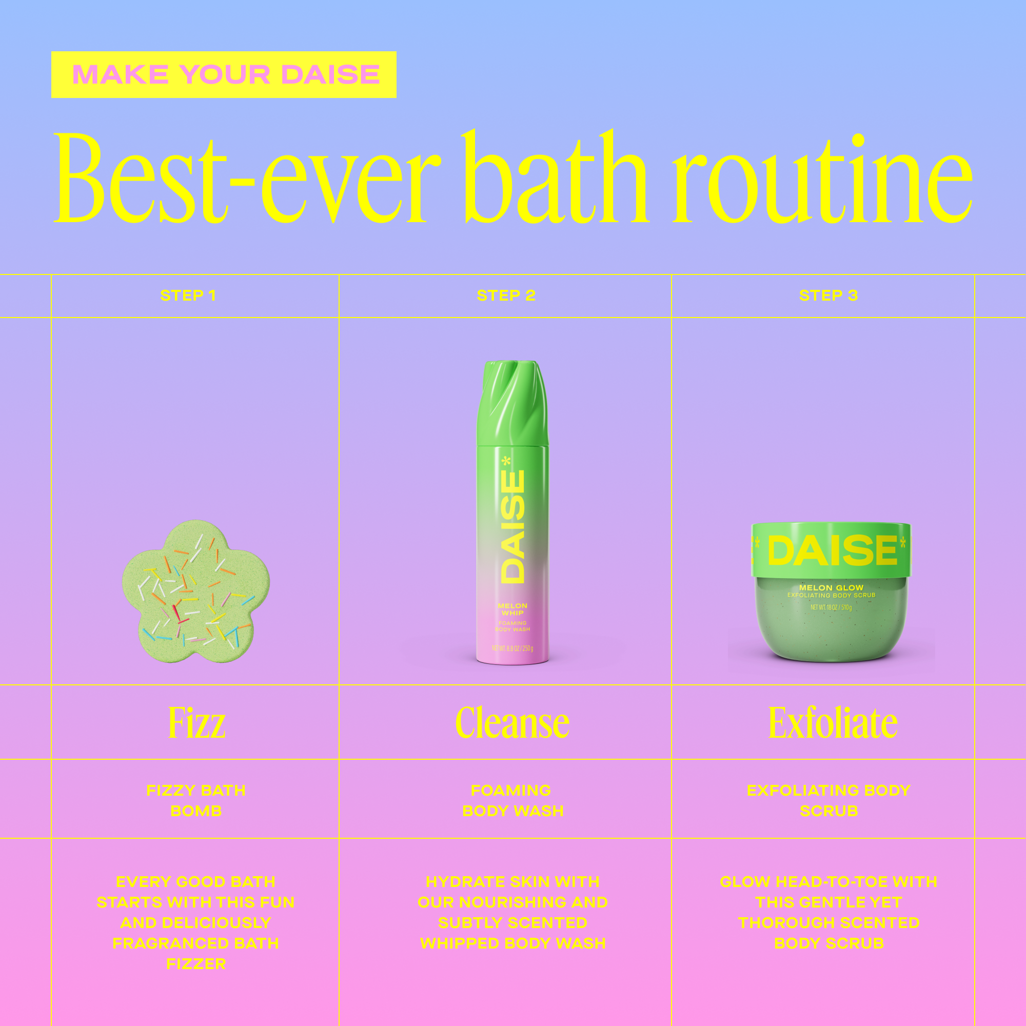 Fill your bathtub with warm water and drop in your bath bomb. Find your DAISE Mini BrandsTM before preparing to get seriously fizzy! Combine with DAISE Body Wash and Body Scrub for the ultimate bath routine.