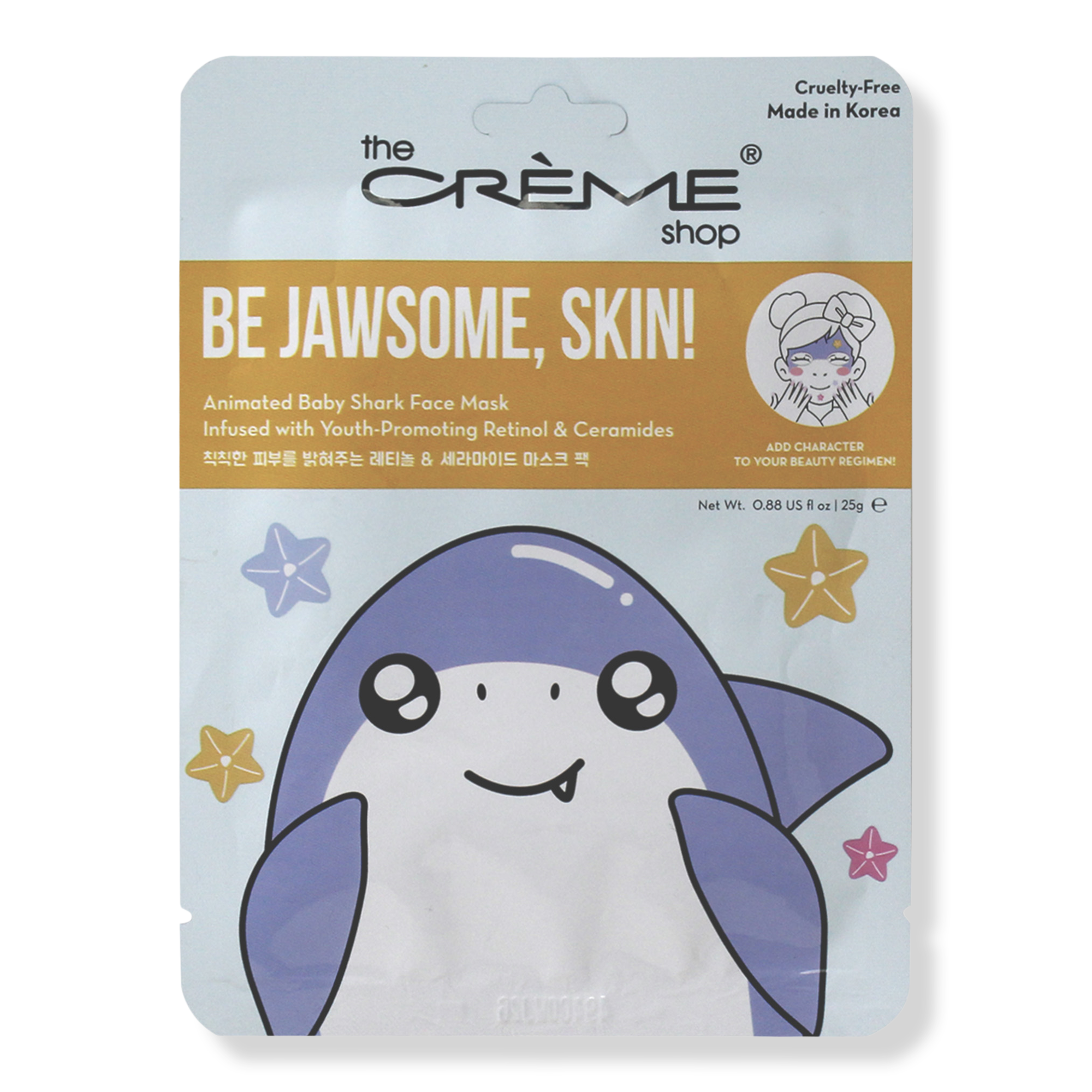 The Crème Shop Be Jawesome, Skin! Animated Baby Shark Sheet Mask promotes smooth, youthful-looking skin like a baby shark! Together, Retinol & Ceramides help restore glowy, hydrated skin.