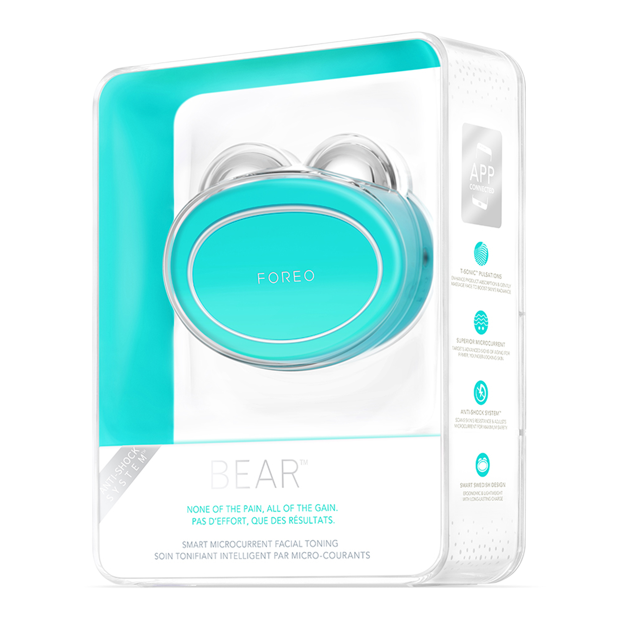 The world's first FDA-cleared medical microcurrent device with Anti-Shock System, combined with T-Sonic massage to safely and effectively train and tone the muscles in your face & neck for lasting youthful results. FOREO BEAR helps reduce the appearance of wrinkles, fine lines and sagging skin.
