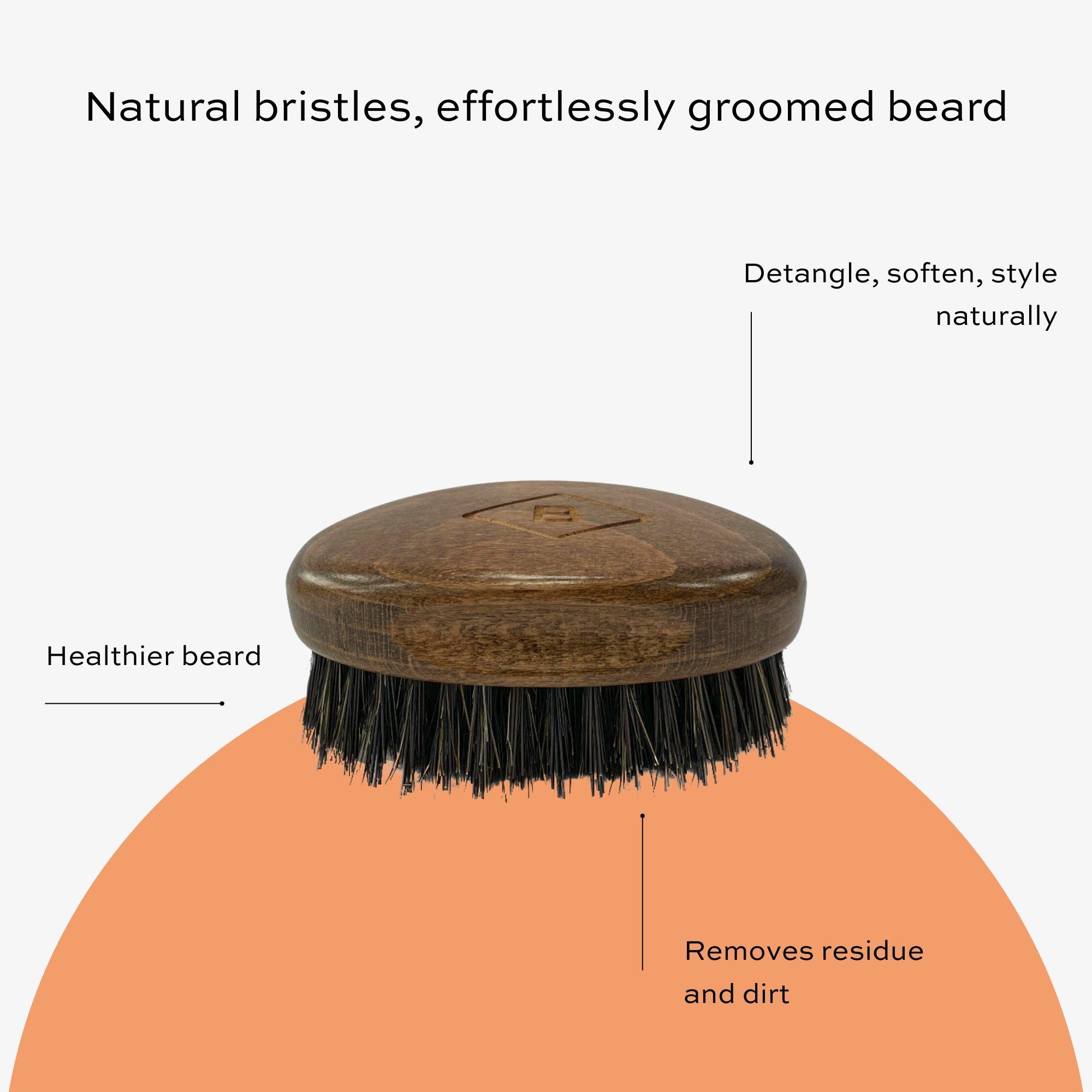 Beard Brush with Natural Boar Bristles detangles, softens and styles facial hair while evenly distributing natural oils from root to tip. Reduces frizz, improves texture & makes daily beard grooming easier for a smoother, healthier-looking, well-groomed beard.