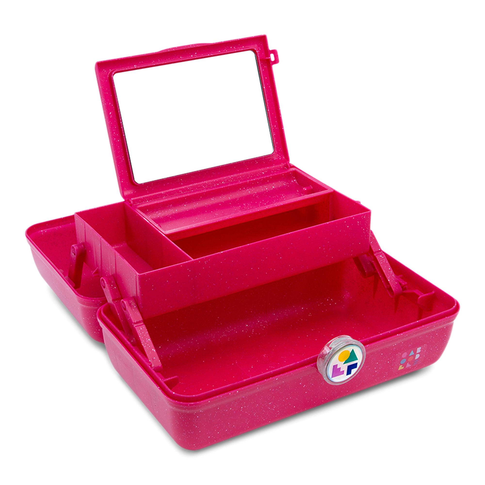 Caboodles iconic On-The-Go-Girl Cosmetic Case has a retro vibe and functional form. The top portion features a flip lid, mirror, and a tray with compartments for easy organization. The bottom compartment has space for larger glam essentials. A sturdy design makes this an ideal travel case.