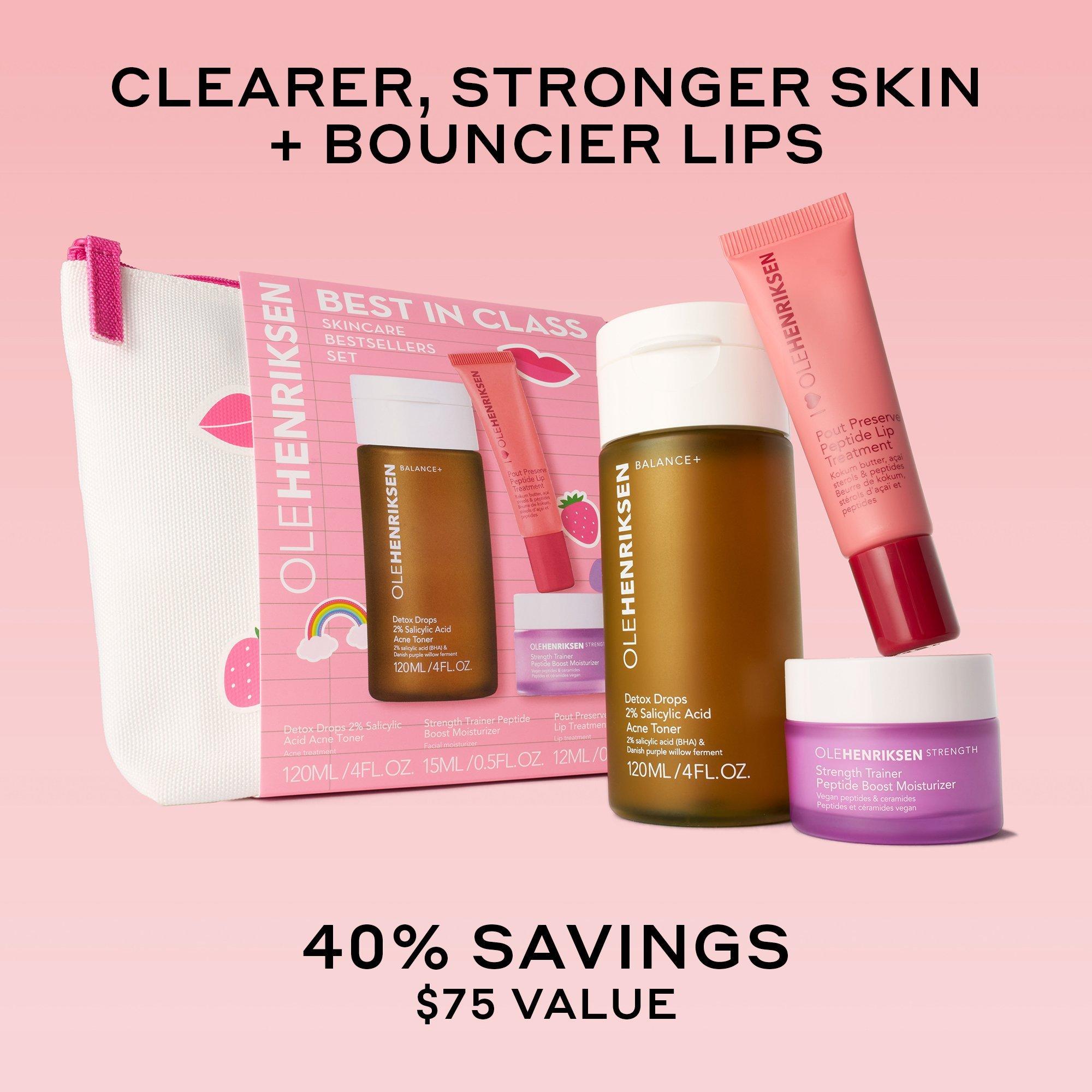 The OLEHENRIKSEN Best in Class Skincare Essential Set is a 3-step skincare routine featuring bestselling Pout Preserve Peptide Lip Treatment in Strawberry Sorbet, Strength Moisturizer and new Detox Drops Acne Toner, to reveal clear, bouncy skin and a plump, smooth pout.