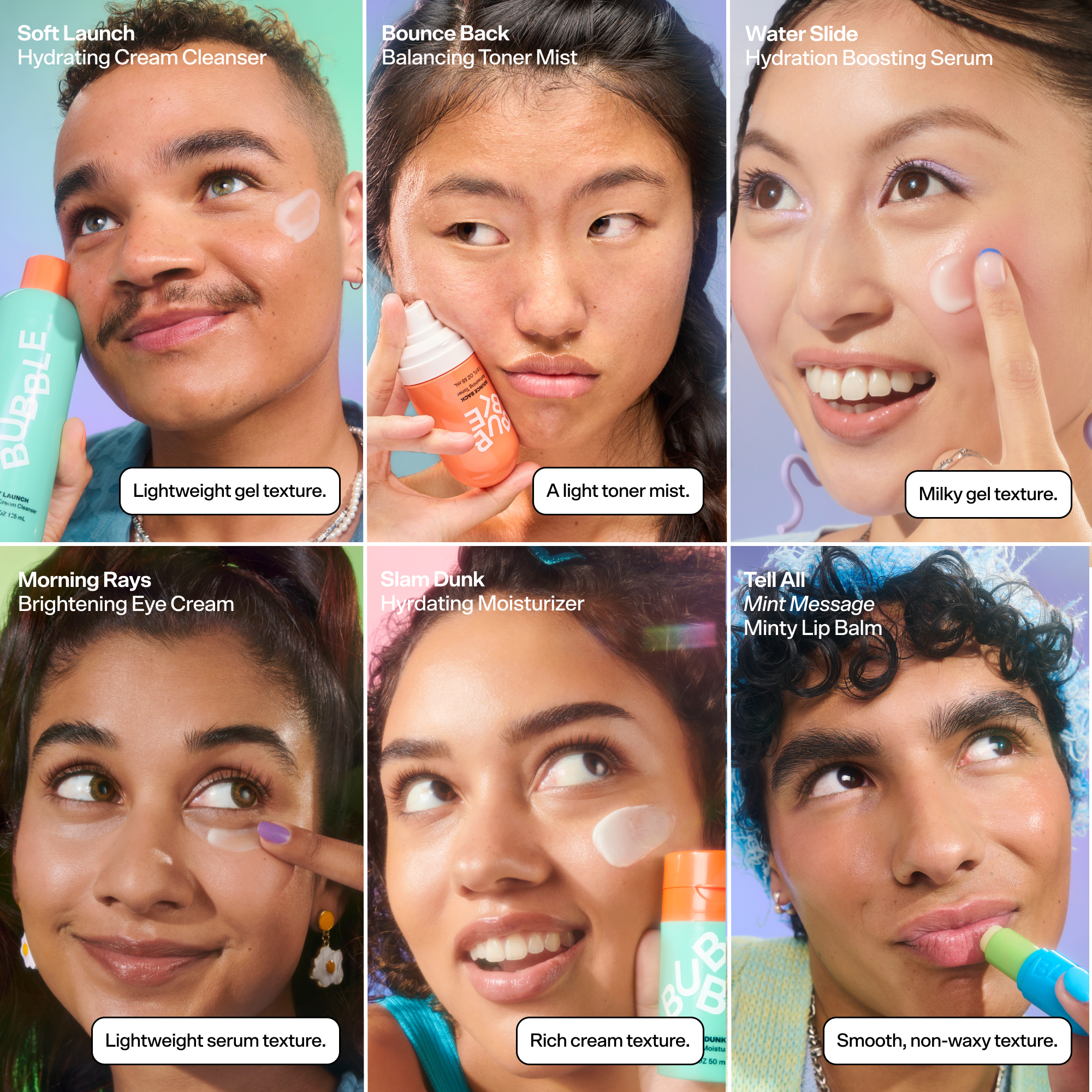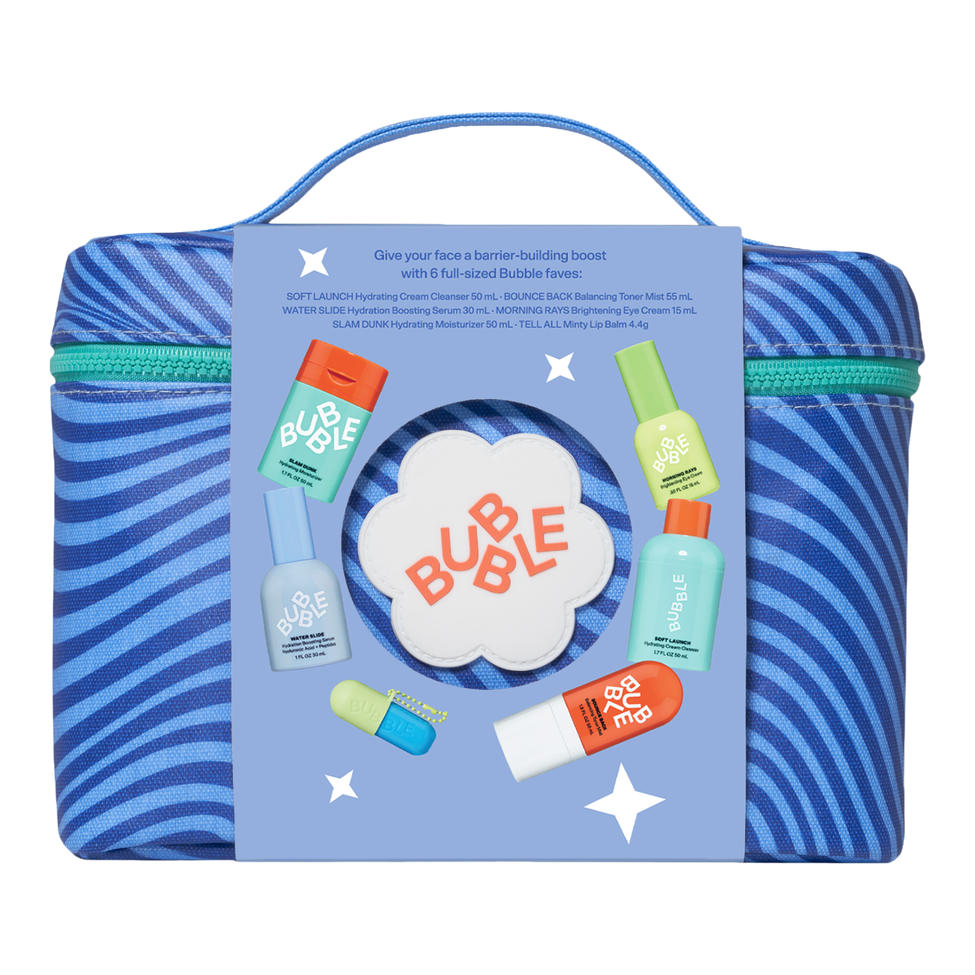 Bubble's Big Barrier Super Set contains SIX full-sized hydrating heroes. This complete routine helps boost your skin’s natural moisture barrier AND leaves dry and dehydrated faces feeling soft, dewy, and balanced.
