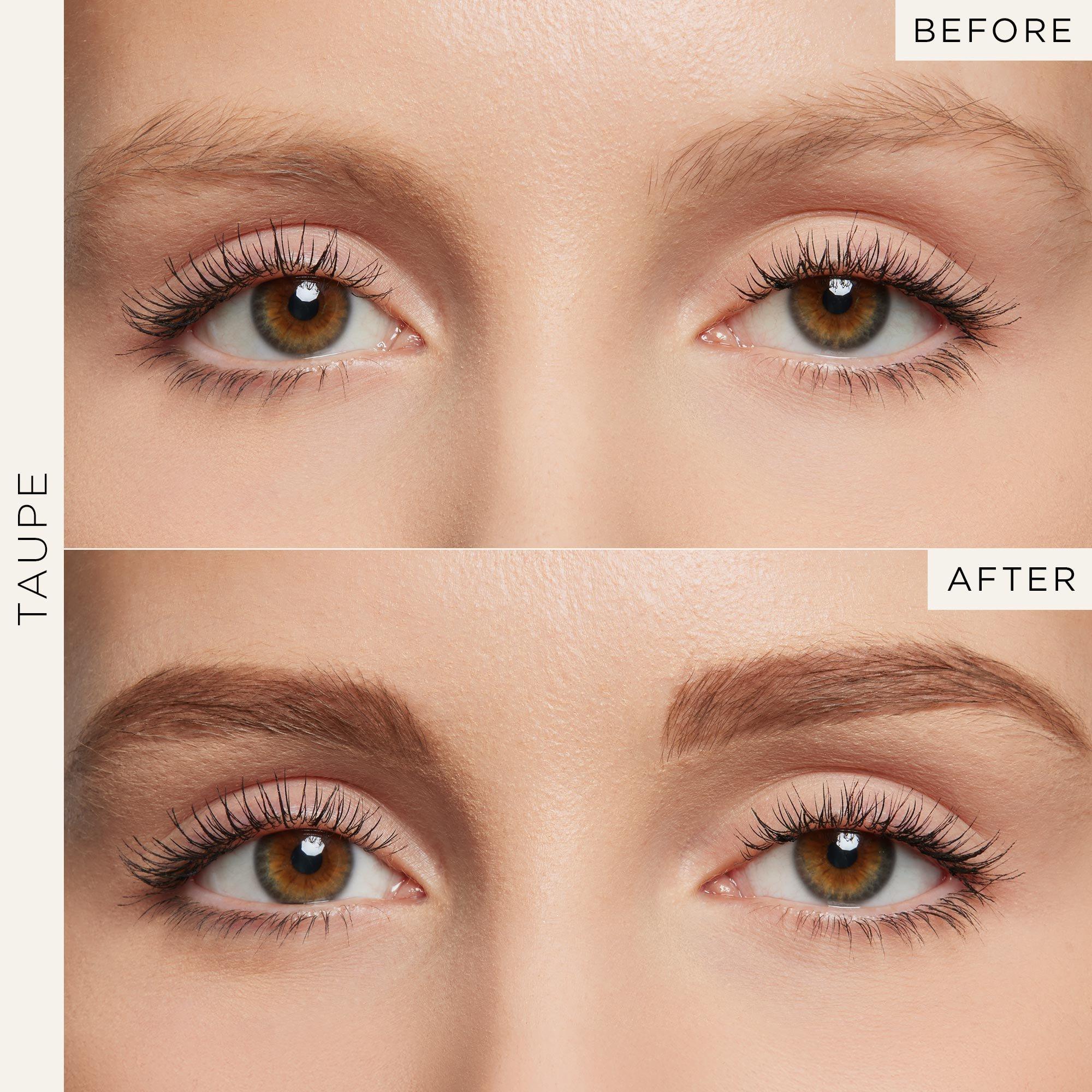 Shape brows using the pencil side of the 2-in-1 tool. Glide the precision tip along the shape of your eyebrow to fill in sparse areas using short, hair-like strokes. Set your brow in place with the tinted gel side by flicking in upward strokes.