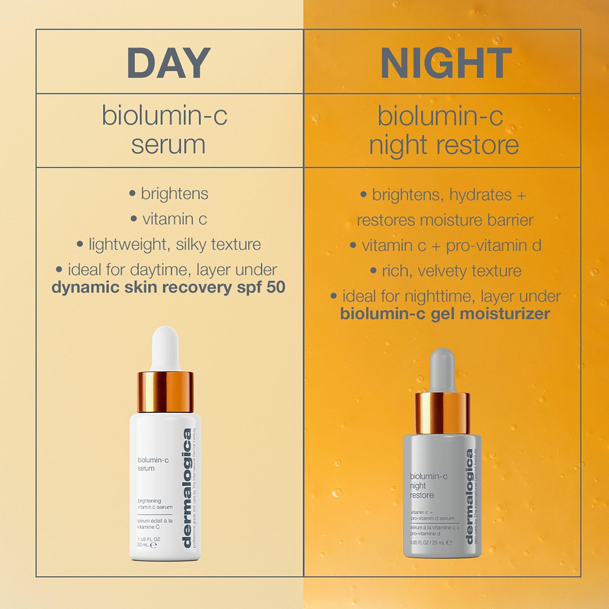 Brighten the night with Dermalogica's Biolumin-C Vitamin C Night Restore Serum, which helps restore the moisture barrier for long-lasting radiance, hydration, and improved tone. Your C + D product is finally here to reset healthy, resilient skin.
