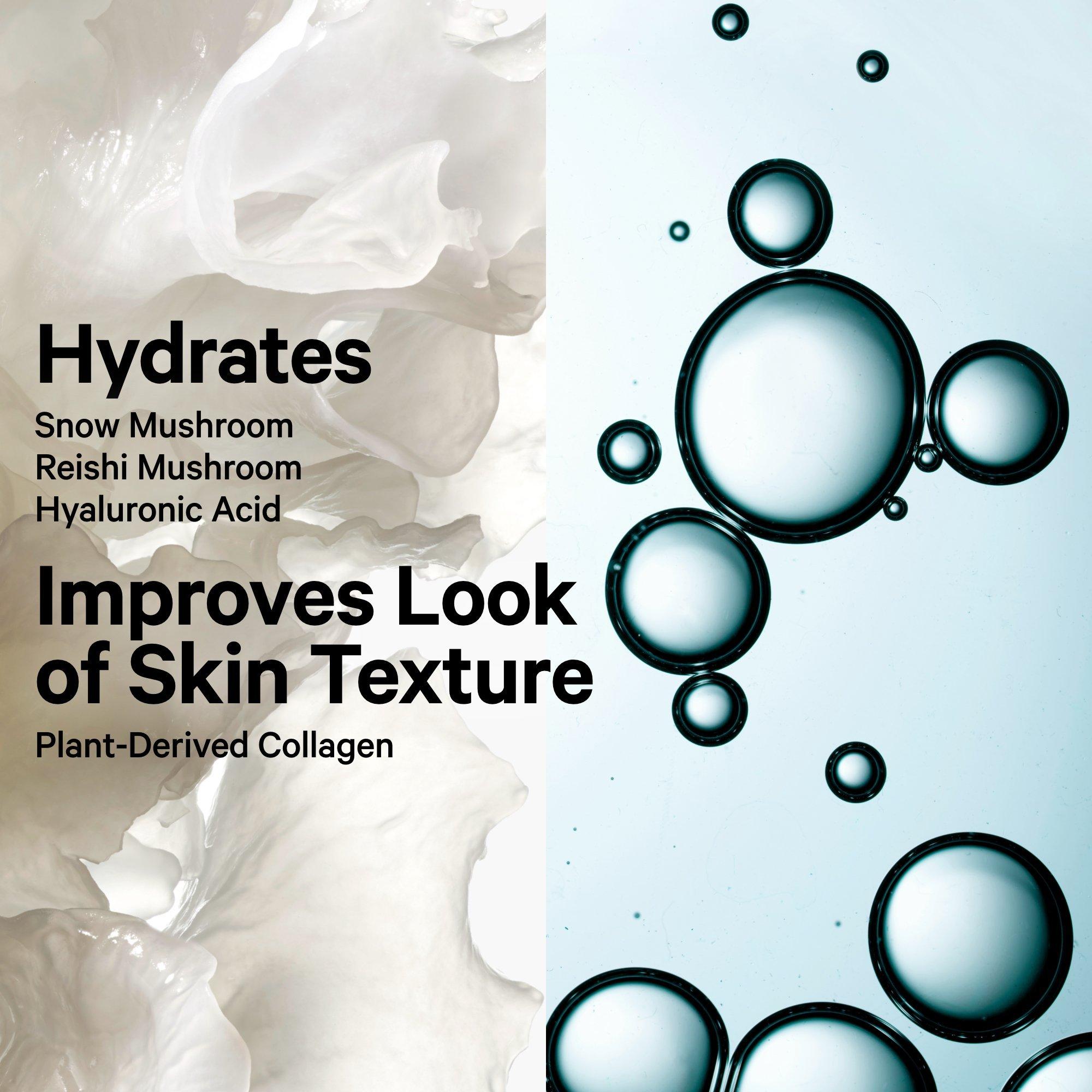 • Hyaluronic acid, snow mushroom, and reishi mushroom hydrate for plumper, smoother-looking skin