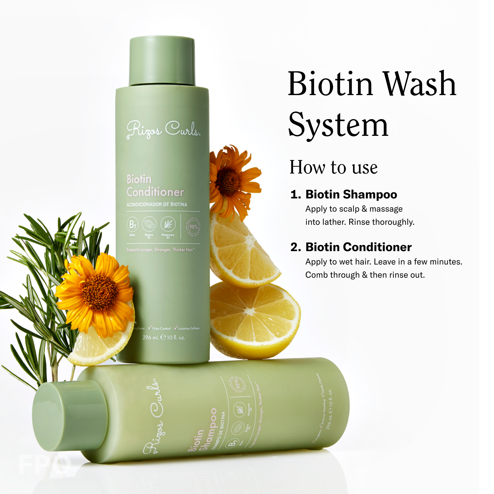 After shampooing with Rizos Curls Biotin Shampoo, apply thoroughly to wet hair. Leave in a few minutes. Comb through \& then rinse out.
