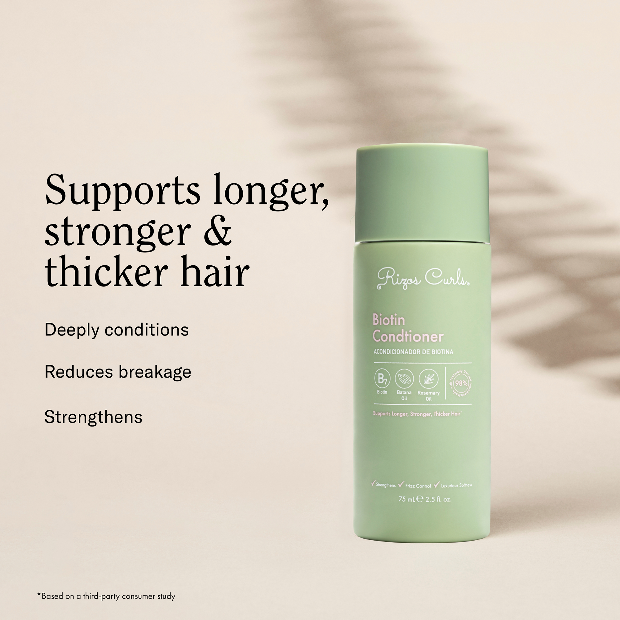Rizos Curls Biotin Conditioner is incredibly nourishing and features Biotin, Batana Oil, Rosemary Oil and Oat Protein known for supporting longer and stronger hair. Protects from shedding and breakage and reduces frizz. Detangling formula with extra slip. For stronger, softer and shinier hair.
