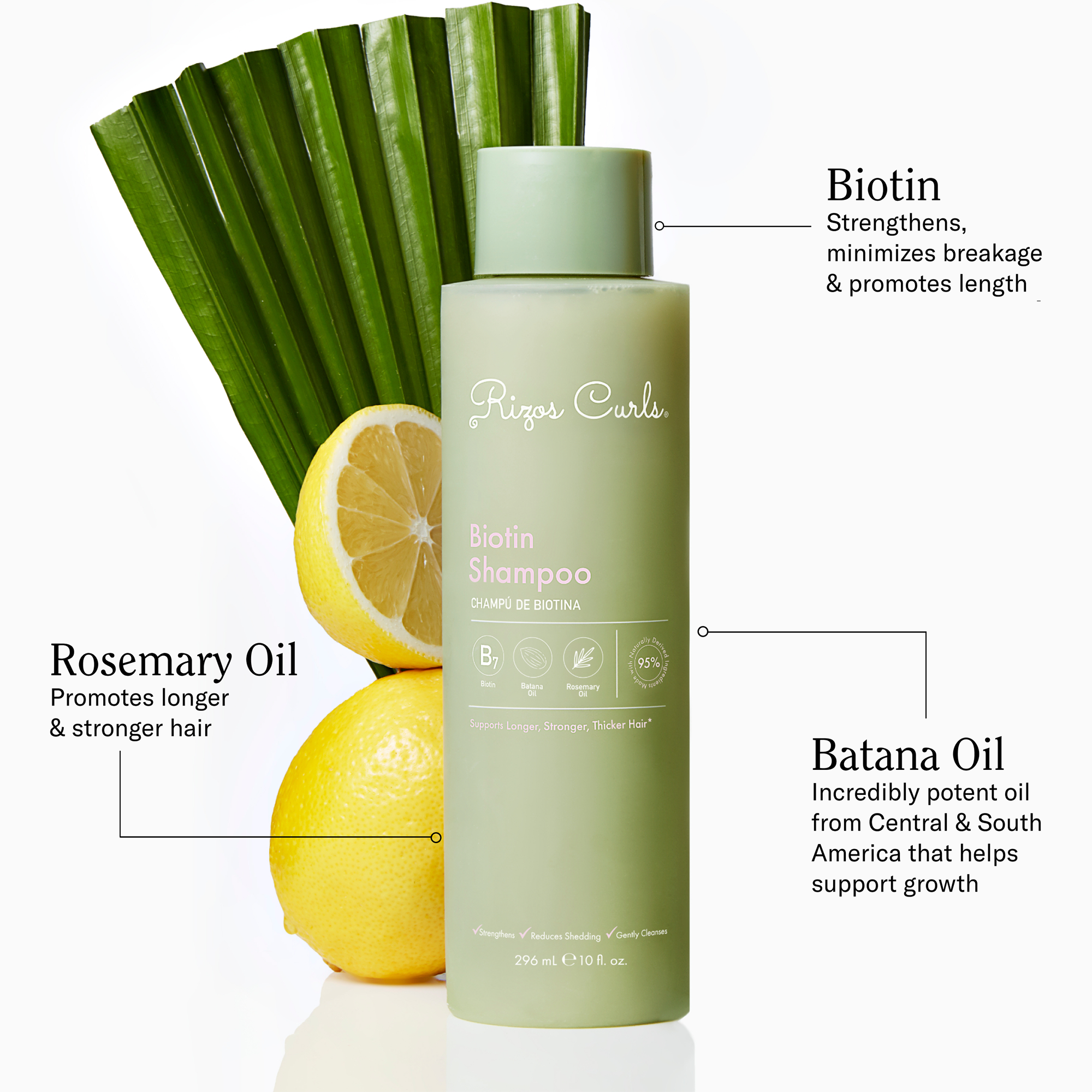 Rizos Curls Biotin Shampoo enriches with the benefits of Biotin and strengthening botanicals that support longer and stronger hair. It gently cleanses, strengthens and reduces shedding. Made with Biotin, Batana Oil, Rosemary Oil and Oat Protein. For longer, softer, healthier and radiant hair.