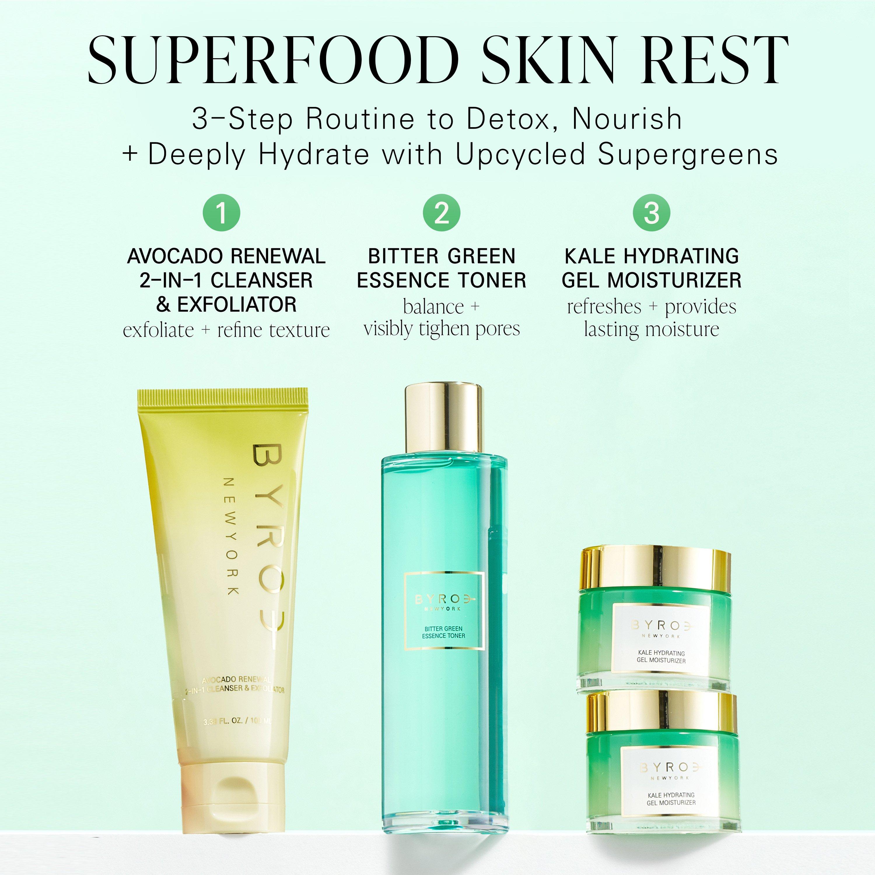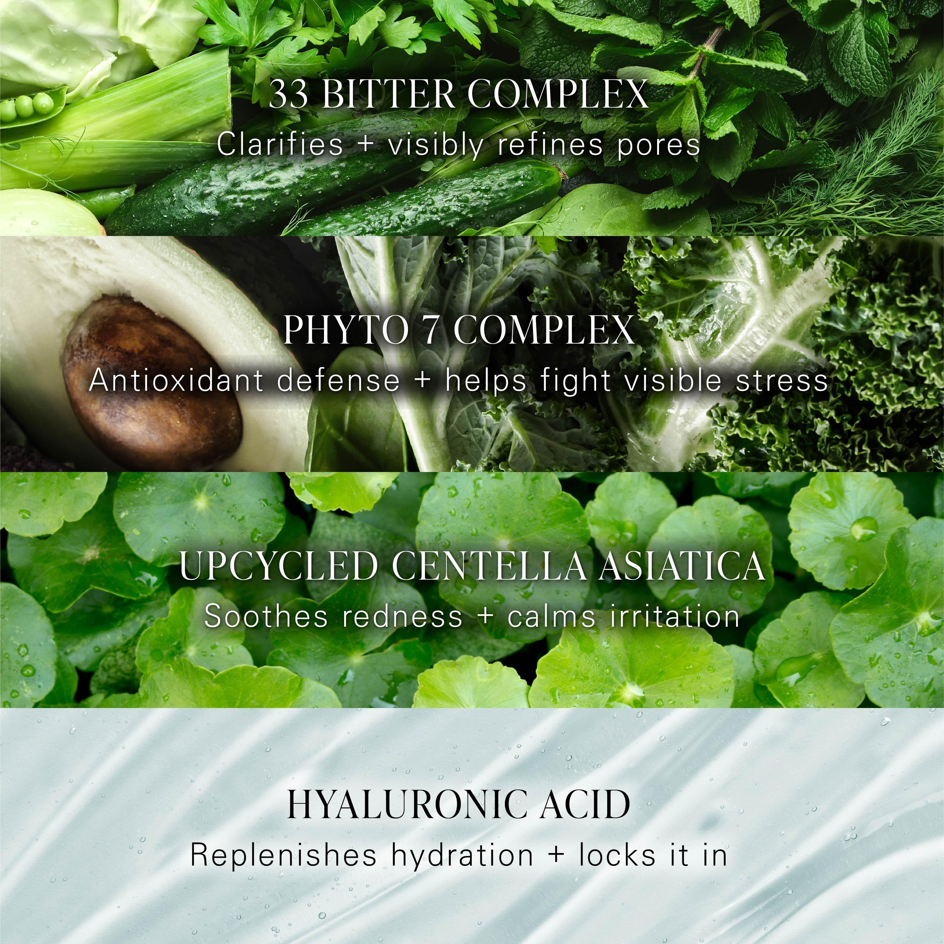 Power-packed green hybrid essence toner with 33 superfood vegetables that refreshes, visibly tightens pores, and boosts hydration.