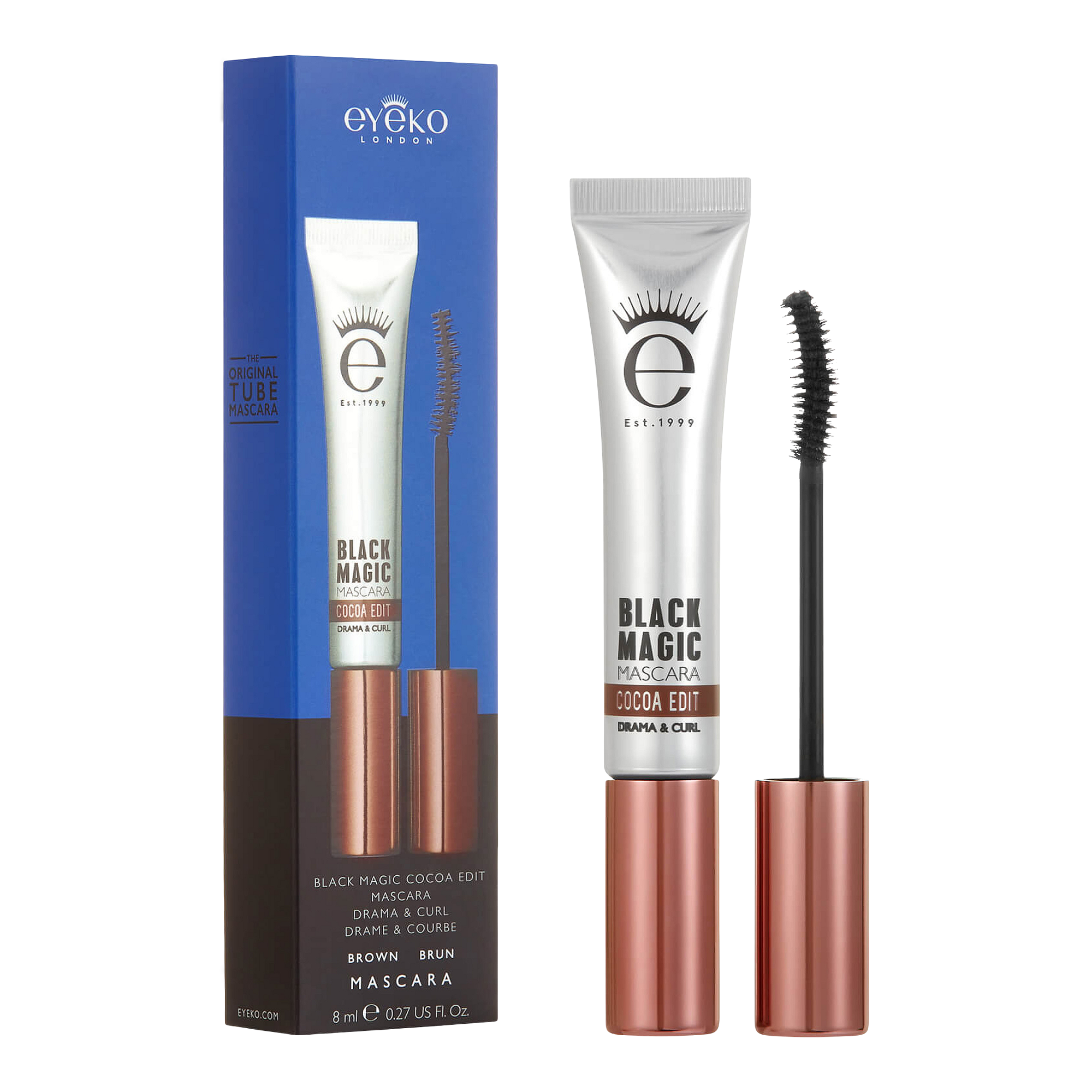 Meet Black Magic: Cocoa Edit Mascara, Eyeko's best-selling Black Magic Mascara, in a warm brown tone. Infused with Keratin and Shea Butter to condition, Eyeko's ultimate mascara combines drama, volume and curl with a beautifully natural warm brown tone to enhance your lashes like no other.