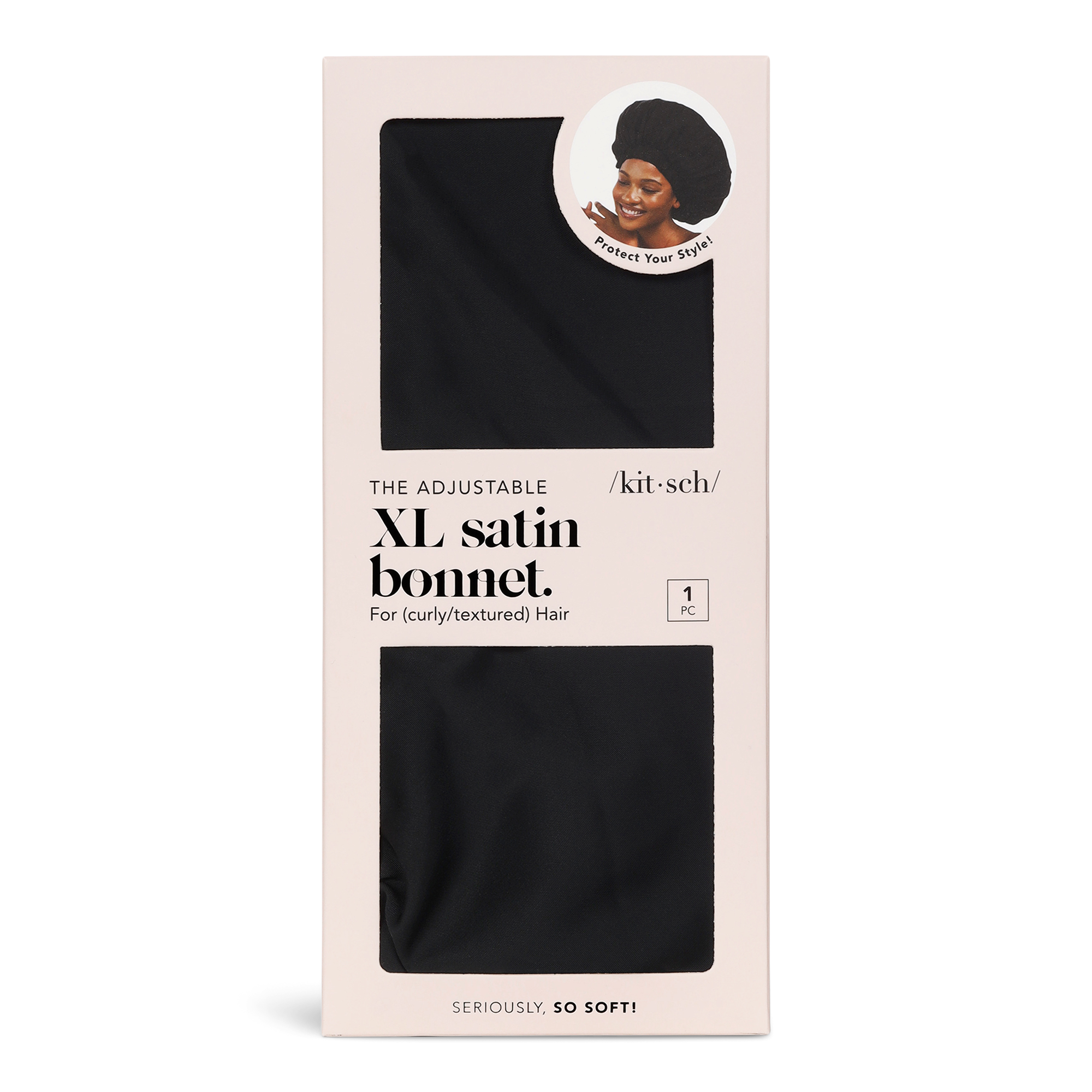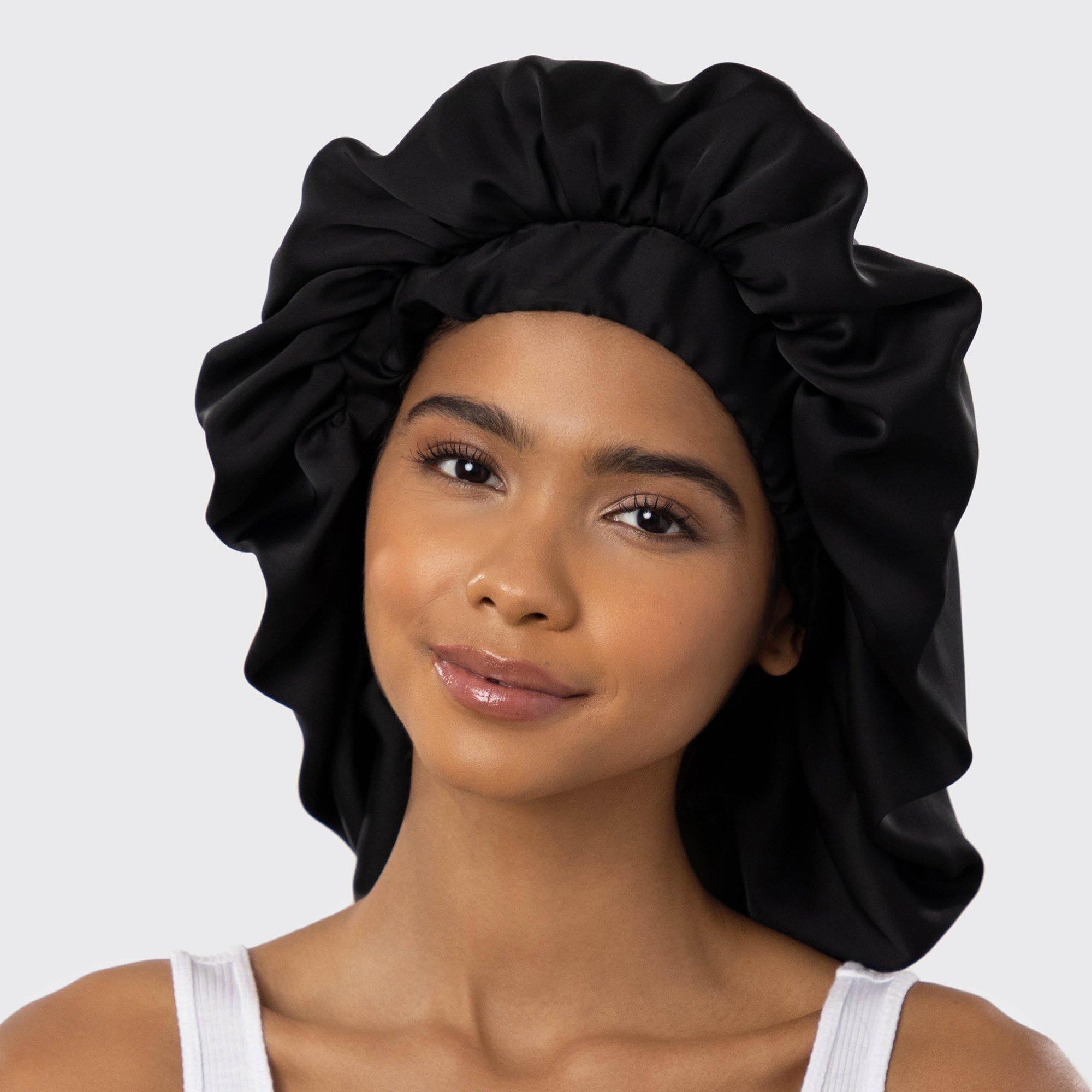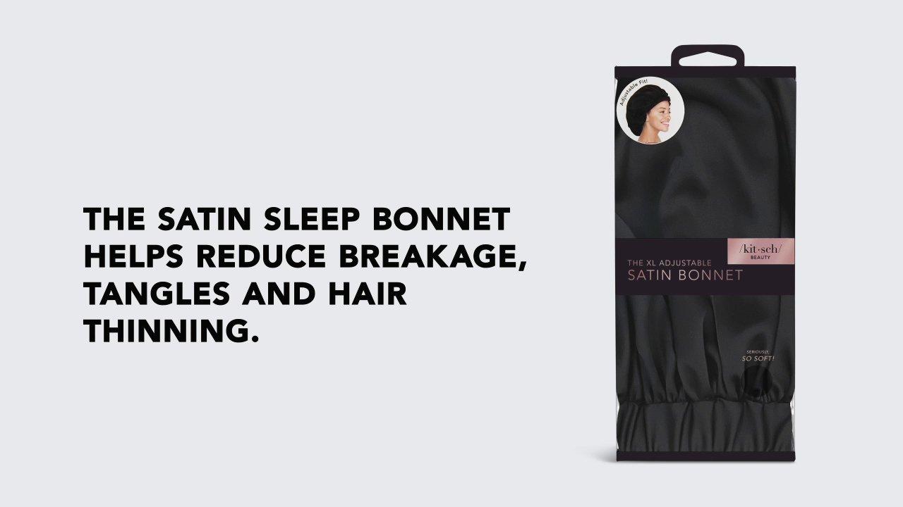 Kitsch Black Satin Sleep Bonnet will save your style while you sleep. High quality satin creates a luxurious friction-free barrier for all hair types. Helps reduce breakage, tangles and hair thinning.