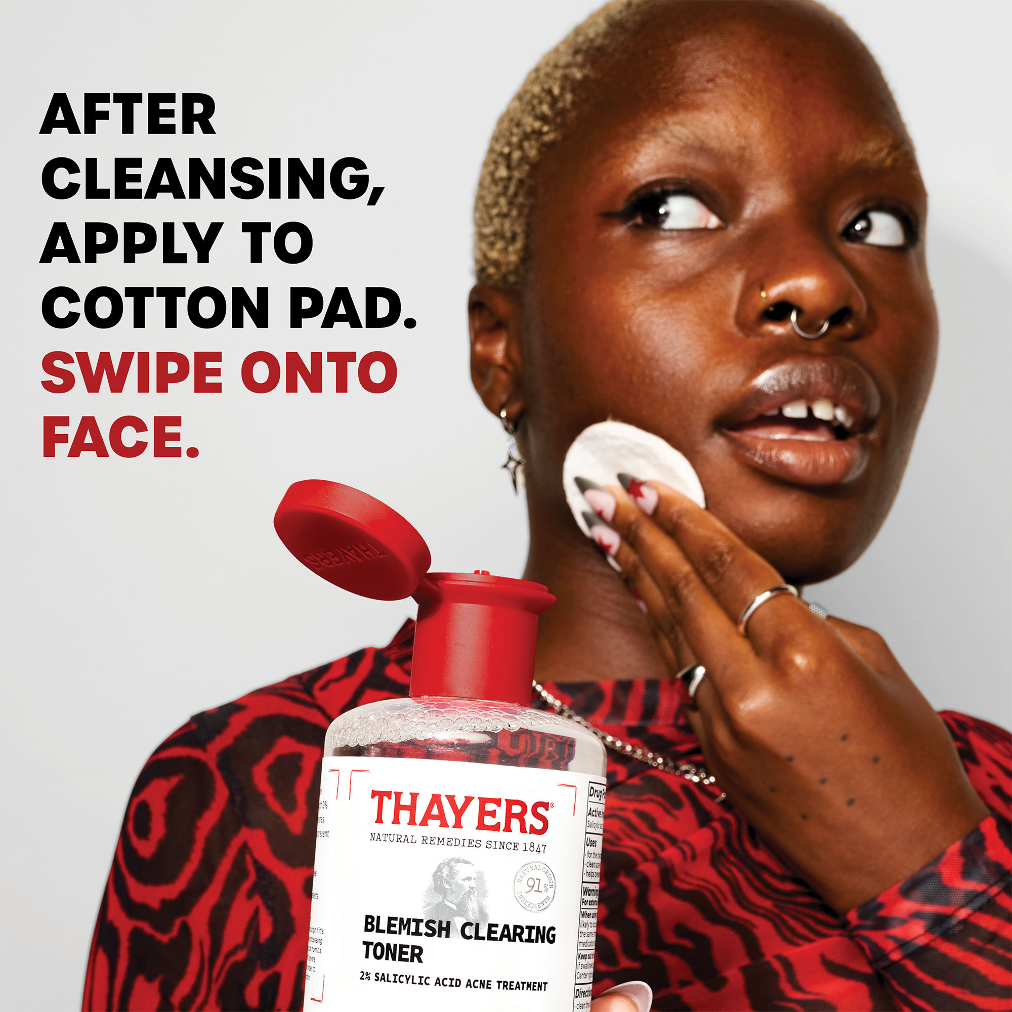 Apply with cotton ball or soft pad to cleansed, dry skin. For best results, use after Thayers Blemish Clearing Cleanser and follow with Thayers Blemish Clearing Balm.