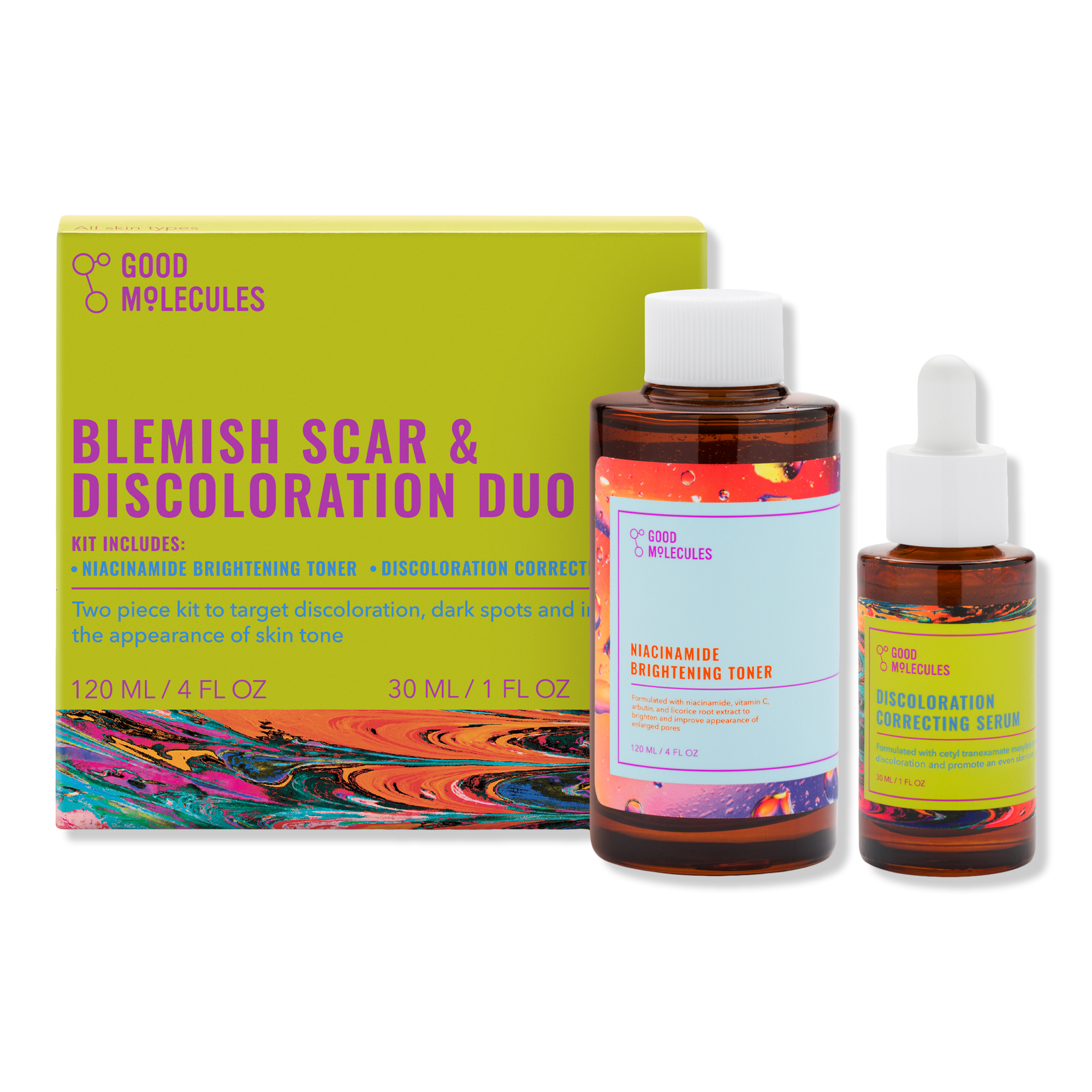 The Good Molecules Blemish Scar & Discoloration Duo is a 2 Piece kit featuring bestsellers to target discoloration, dark spots and improve the appearance of skin tone.