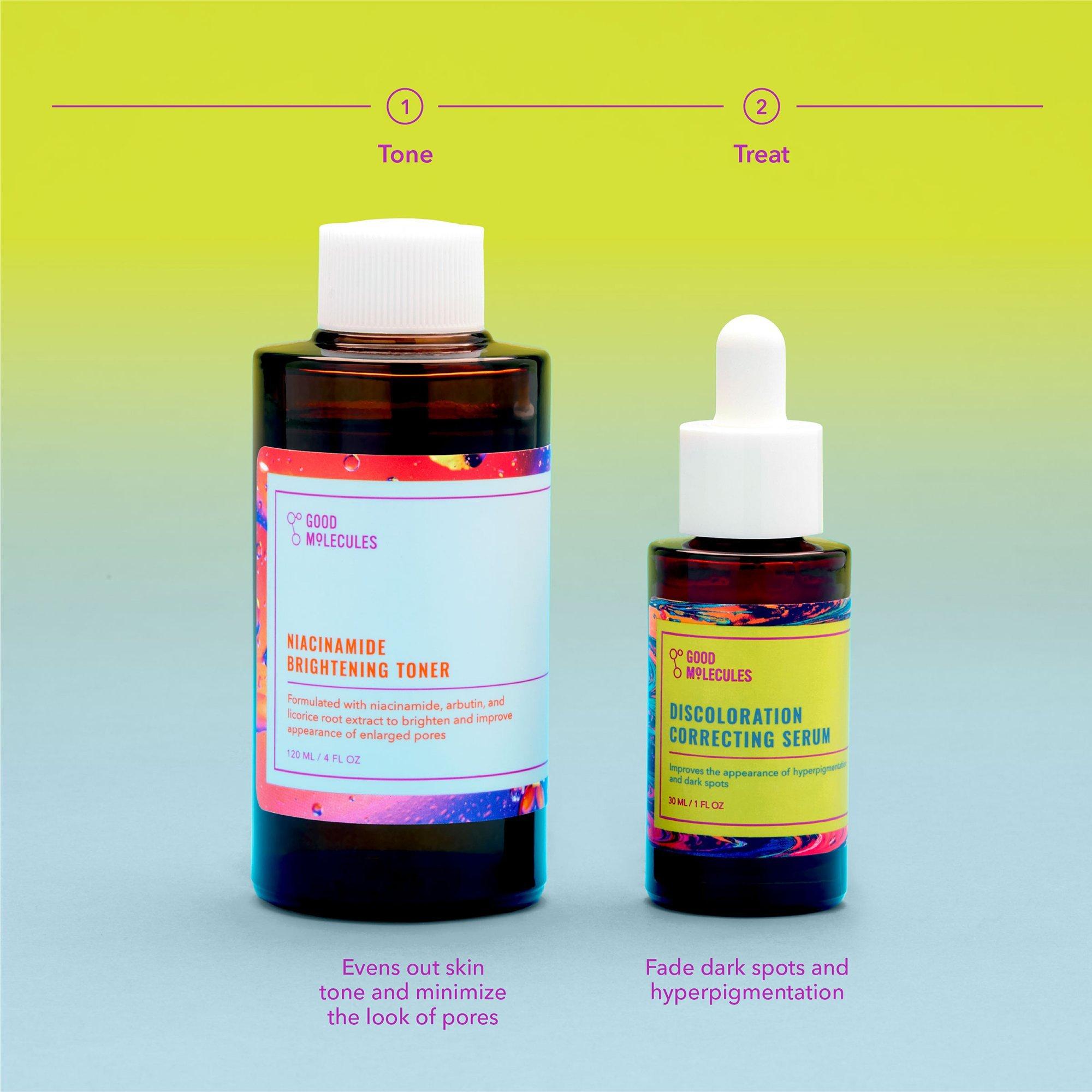 The Good Molecules Blemish Scar & Discoloration Duo is a 2 Piece kit featuring bestsellers to target discoloration, dark spots and improve the appearance of skin tone.
