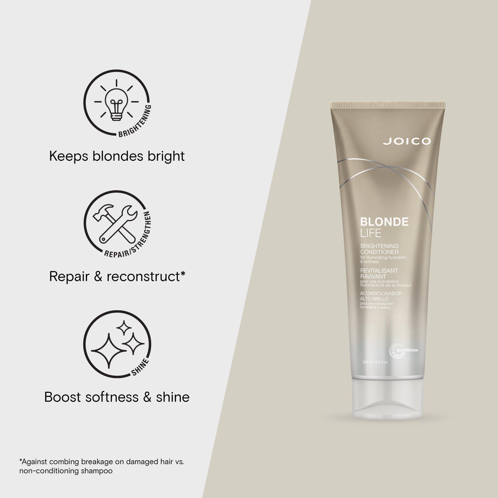 Joico Blonde Life Brightening Conditioner fights off-tones, frizz, and dryness, while delivering the kind of champagne shine that polishes hair to a high gleam without weighing down a single highlighted strand.