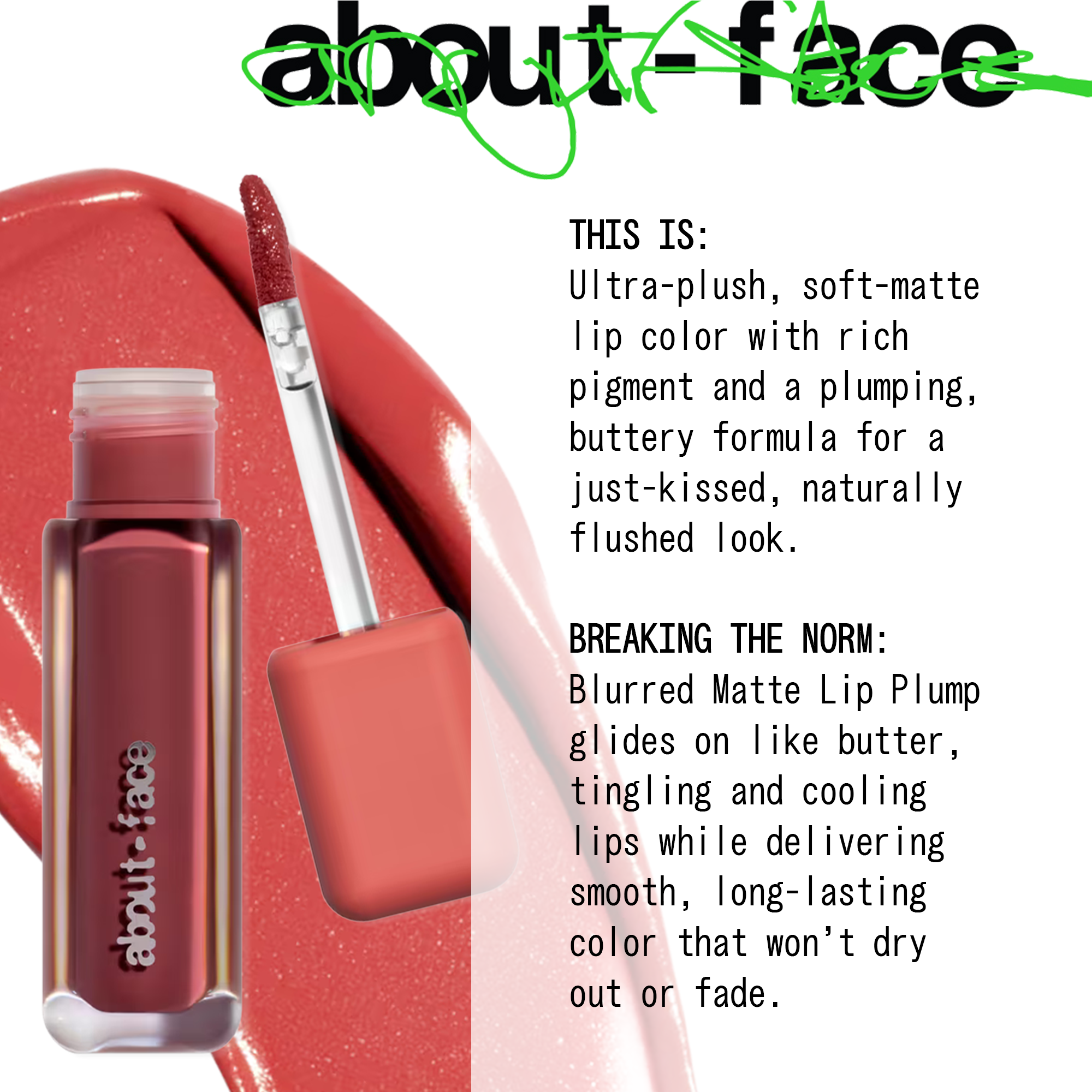 Blurred Matte Lip Plump from about-face is a unique, creamy soft-matte lip color that helps to moisturize + plump your pout for a fuller look.