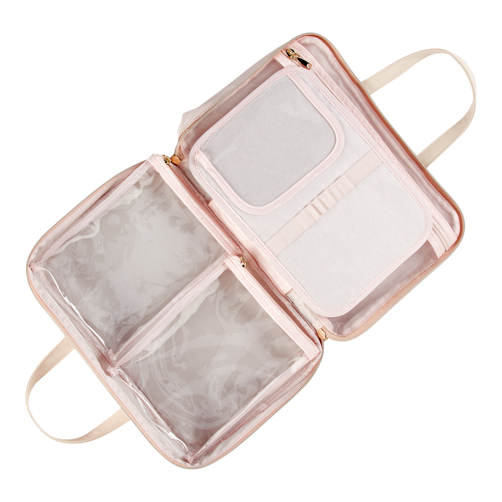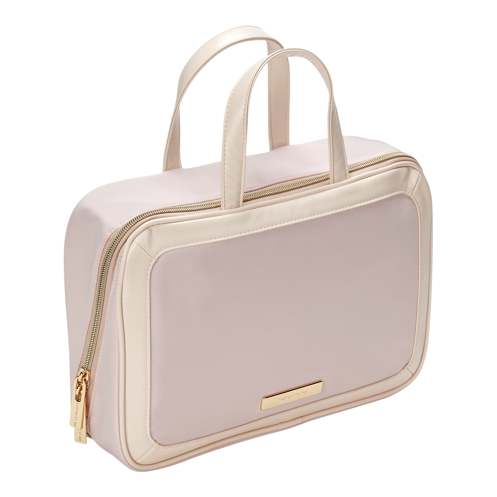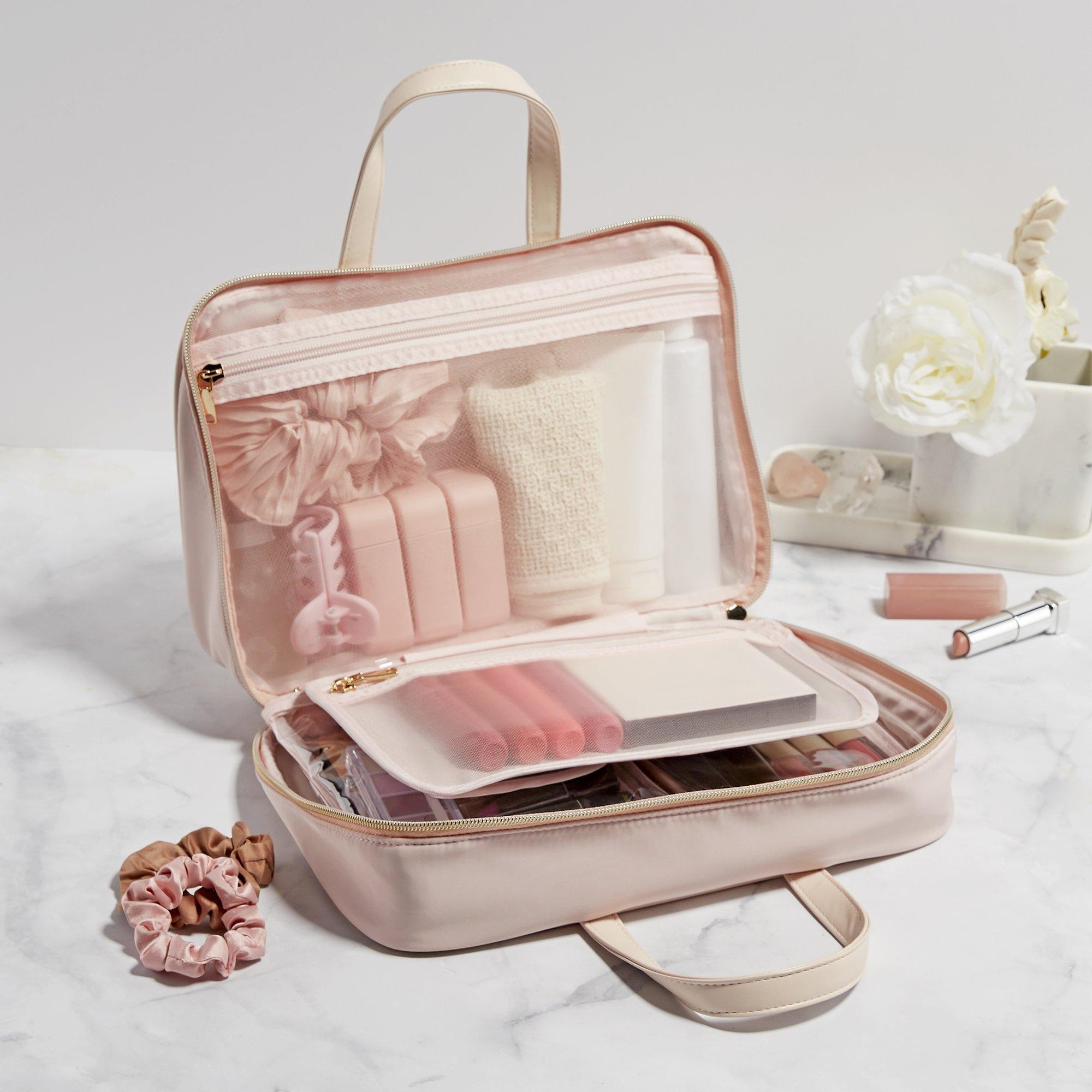 This Tartan + Twine pale pink Blushing Deluxe Weekender is your new travel BFF! Chic, roomy, and organized with 2 removable bags, elastic brush slots, and gold-tone hardware.