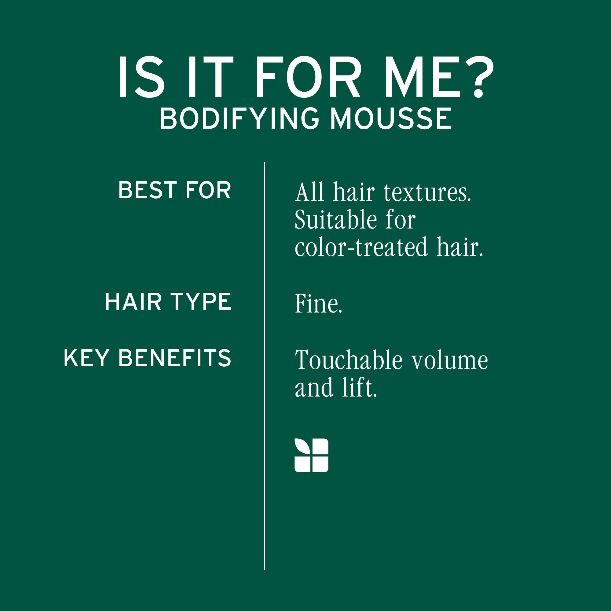 Achieve bouncy volume and touchable lift with Biolage Bodifying Mousse. This lightweight, whipped mousse adds body and height to fine hair while providing light hold and shape retention.