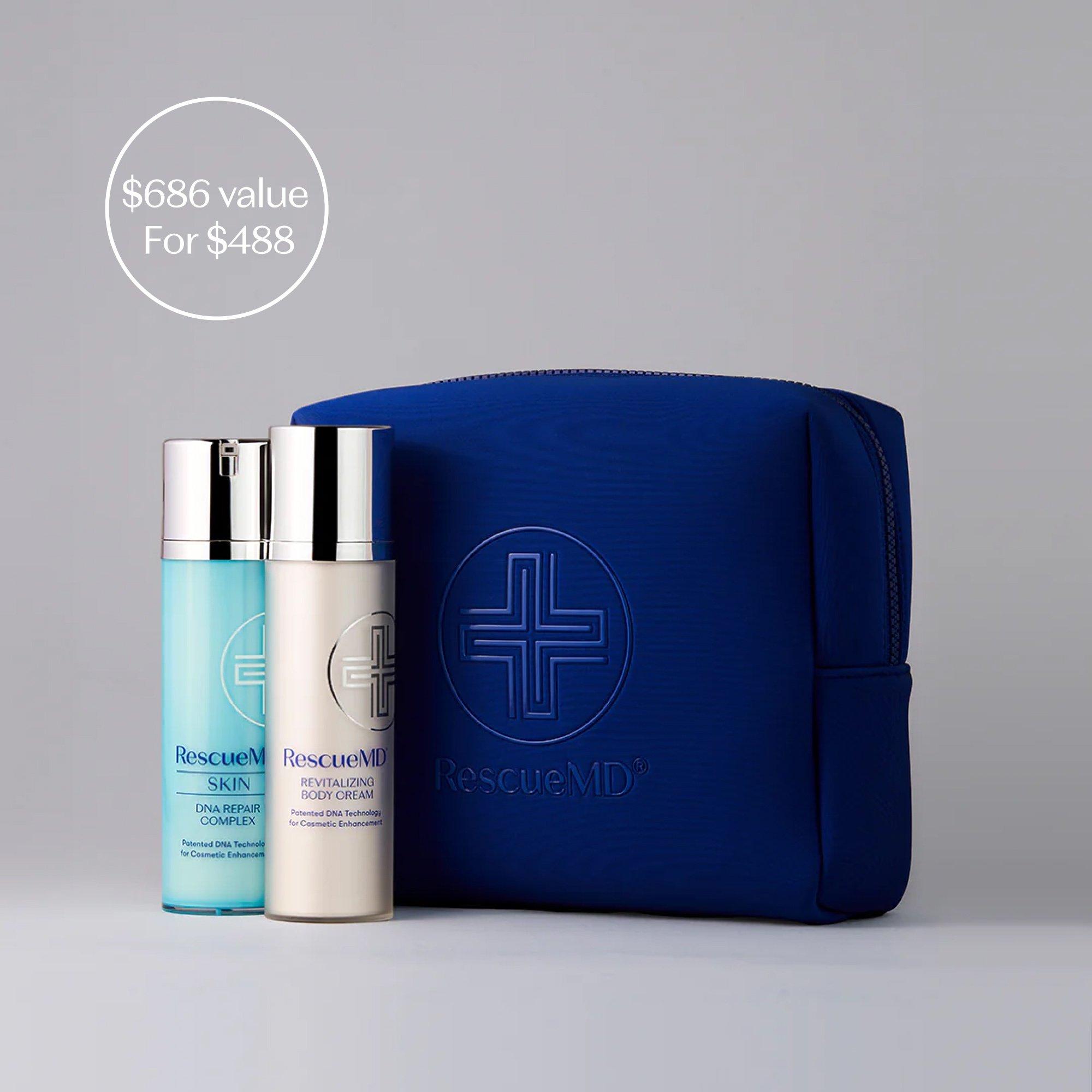 RescueMD’s Body Recovery Set offers the ultimate duo to help revitalize skin from head to toe, delivering intensive nourishment and complete restoration for a healthier, more radiant complexion. Includes a sleek neoprene bag for beauty essentials.