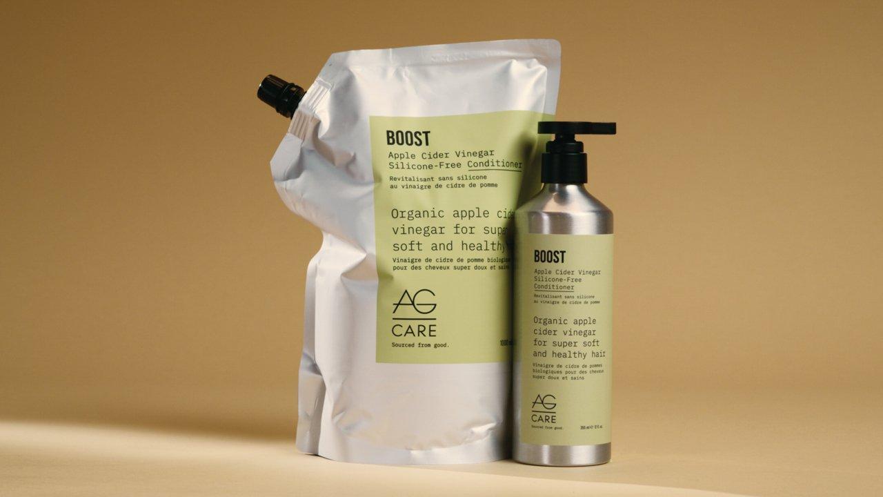 Condition and smooth cuticles while sealing in moisture with mango seed butter, apple cider vinegar and an abundance of nourishing superfoods in this 98% Plant-Based Essentials Boost Apple Cider Vinegar Silicone-Free Conditioner by AG Care.
