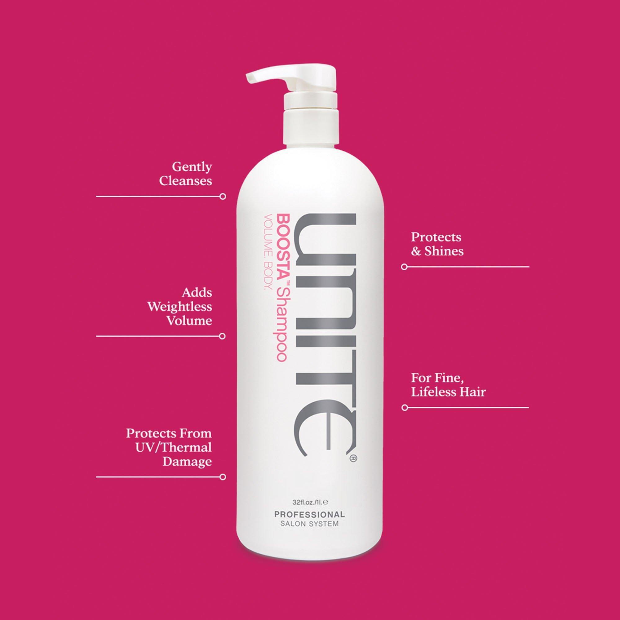 UNITE Hair's BOOSTA Shampoo For Volume gently cleanses and removes build-up. Plus, adds weightless volume, body, moisture and shine to limp/lifeless locks.