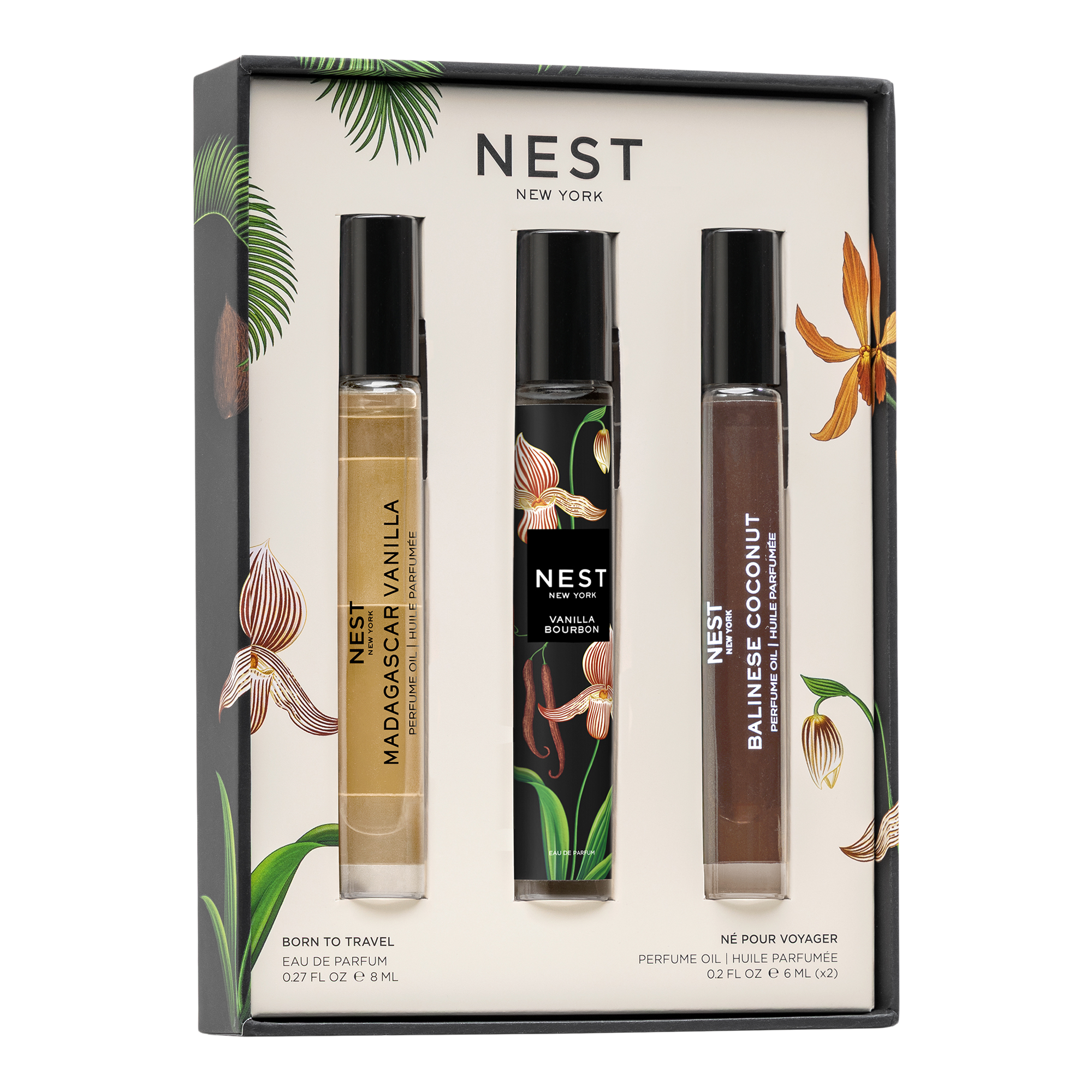 No matter where you're heading, these bestselling fragrances are always ready for takeoff. The travel-ready trio from NEST New York includes a Madagascar Vanilla Perfume Oil Rollerball, a Balinese Coconut Perfume Oil Rollerball, and a Vanilla Bourbon Eau de Parfum Travel Spray.